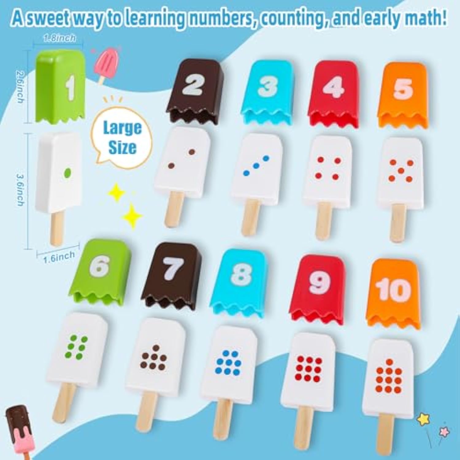 | [1-10 Digital Matching Learning Toy]: The Number Learning Ice Cream Toy Includes 10 Ice Creams And 10 Detachable Ice Cream Lids. The Ice Creams Are Printed With Different Numbers Of Colorful Dots, And The Lids Are Printed With Corresponding Numbers, Words, And Fruits Matching The Quantities. It Helps Children Recognize Numbers, Count, And Even Perform Simple Addition And Subtraction While Having Fun | | [Fine Motor Fun]: With Various Bright Colors, The Number Learning Toy Not Only Enables Digital Exploration But Also Promotes Color Recognition. Children Can Develop Fine Motor Skills And Hand-Eye Coordination By Taking Off And Putting On The Ice Cream Lids During The Matching Game. You Can Enjoy Fun And Intimate Moments With Your Kids | | [Fun Preschool Learning Activity]: The Lightweight Digital Ice Cream Toy Is Perfectly Sized For Little Hands To Explore Number Matching Games. Whether At Home Or In A Nursery, Digital Ice Cream Turns Number Recognition Into A Pleasant Experience, Helping 3-6-Year-Olds Identify Numbers Through Interactive Games And Making Learning Enjoyable | | [Sturdy Ice Cream Toy]: The Number Matching Toy Is Made Of High-Quality Materials With Smooth Edges, Durable And Easy To Clean, Protecting Your Children From Harm While Playing. The Large Size Design Is More Suitable For Children To Grasp, And The Cute Ice Cream Stick Shape Is Deeply Loved By Kids, Keeping Them Interested In Finding And Matching Numbers | | [Perfect Gift For Toddlers]: The Toy Comes With A Storage Bag For Easy Organization And Portability, Allowing Toddlers To Play Indoor/Outdoor Activities With Parents Or Friends At Home Or During Car Trips. It'S A Thoughtful Gift For Back-To-School, Holidays, And Birthdays. It'S Also A Practical Educational Toy Essential For Kindergarten Classrooms And Teachers | |