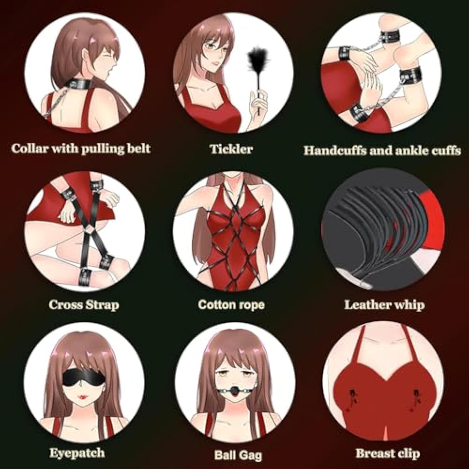 | ?High Quality Handmade? All-Over Stitched Design, More Sturdy Quality. The Handcuffs, Anklets And Collar Are Covered With A Thick Layer Of Down, Soft And Comfortable, Protecting Every Inch Of Her Skin During Her Unbridled Struggle. | | ?Versatile For More Positions And New Scenarios?This Sex Bondage Kit Consists Of 10 Parts, A Pair Of Handcuffs, A Pair Of Ankle Cuffs, A Ball Stopper, A Collar, A Blindfold, And A Leather Whip, A Traction Rope, A Feather Tickler, Nipple Clamps, A Cross Strap. Those Couples Sex Set Made Of Superior Leather And Nylon Material, Safe And Comfortable. | | ?Adjustable?This Sex Bondage Is Adjustable In Size With Buckles, Cuffs With Velcro. There Are Metal Holes On The Left And Right Side Of The Strap That Allow You To Easily Adjust The Length To Fit Your Posture, Suitable For Any Type Of Body. | | ?Perfect For Beginners And Connoisseurs Alike? This Bdsm Toys Of 10-Piece Set Contains Everything You Need To Explore Bondage, The Bondage Kit Is Easy To Handle And Comes Complete With Accessories For Effortless Bondage Work, Suitable For Many Poses. | | ?Multiple Restraint Methods?To Keep You In Different Sexual Position So Your Partner Can Do Whatever He Want With You. This Sex Toy For Couples Will Be The Lubricant Of Love Life, Start Your Romantic Journey Anytime, Anywhere. | |