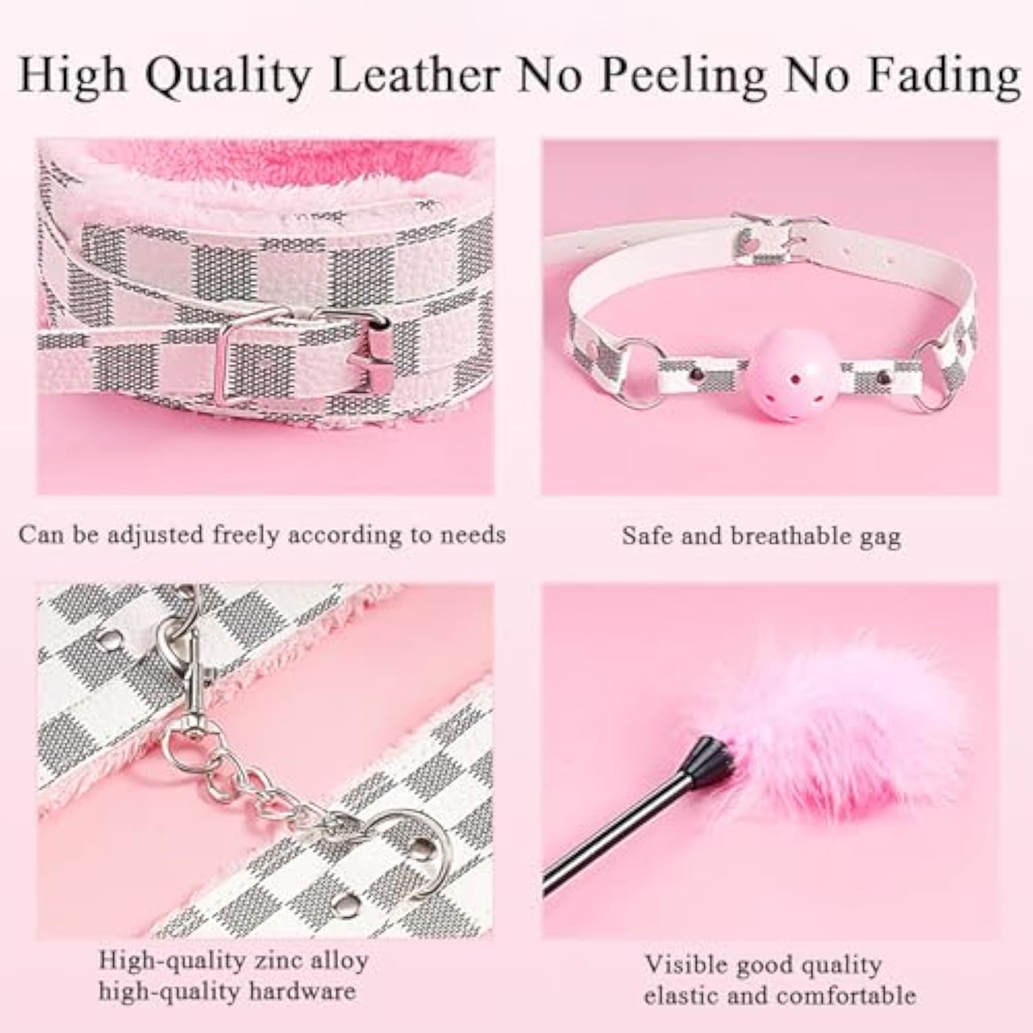 | Grid Design: The Bdsm Kit Features A Striking Black And White Grid Design That Offers Visual Stimulation, While The Plush Lining Ensures Comfort When Worn. | | High-Quality Material: Crafted From Durable Leather With Plush Interior Lining And Zinc Alloy Buckles, This Set Is Built To Last And Can Be Reused Multiple Times. | | Adjustable Size: All Components Of This Bondage Set Are Adjustable For A Secure Yet Comfortable Fit. Suitable For Most Users, Just Avoid Tightening Too Much To Prevent Skin Discomfort. | | Versatile Usage: Ideal For Various Settings Like Bedrooms, Living Rooms, Balconies, Or Rvs, And Perfect For Couples Looking To Explore Role-Play And Bdsm Scenarios. | | Privacy Protection: Takes