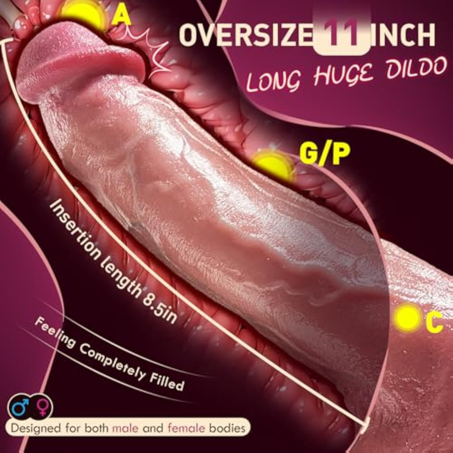 - Advanced Huge Thick Dildo: 11 Inch Overall Length, 8.5In Insertion Length, 2In Thickness.The Soft Testicles And Glans Of The Big Long Dildo Are Designed To Be Pinched For Added Reel Skin Dildo Feeling, Not Just A Stiff Sex Toy. No Matter What Time Of Da