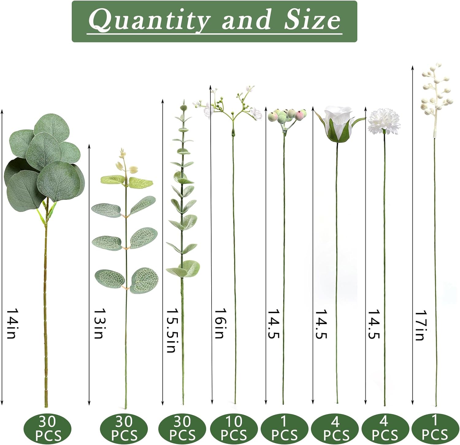 - 110 Pcs 7 Kinds Mixed Eucalyptus Stems and Flowers : include 30 gumdrop eucalyptus, 30 true blue eucalyptus, 30 silver dusty baby eucalyptus,2 berry,4 silk rose,4 white hydrangeas and 10 babysbreaths,as shown in the figure,110 Pcs 7 kinds mixed eucalyptus stems and flowers ,can meet your various flower arrangement needs and home decoration.
