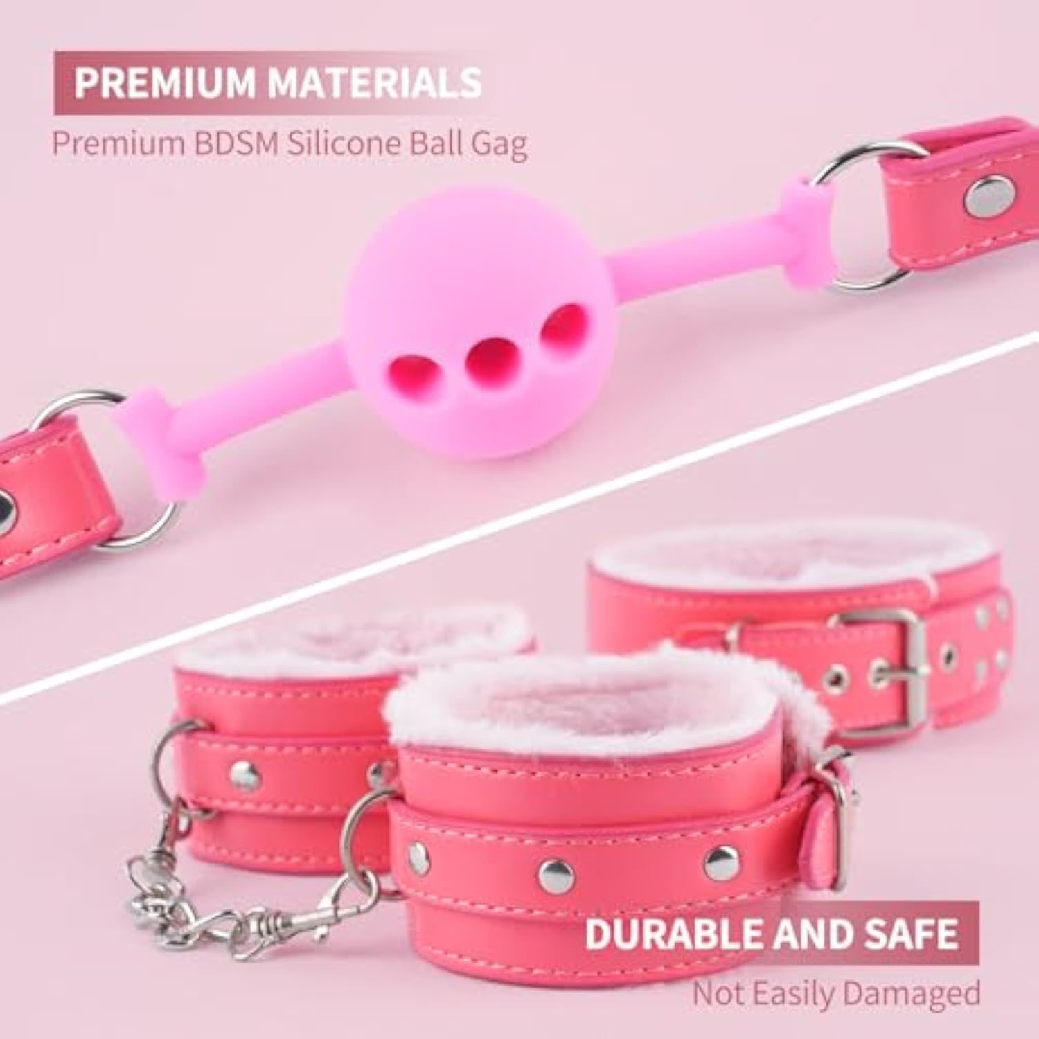 | 2025 New Bdsm Kit For Couples:Updaged 11 Pcs Bondage Set In A Combination Of Rose Pink And Pink. The Rose Pink Highlights The Charm Of Your Submissive, And The Pink Highlights Cuteness. Your Partner Can Play Different Roles During Your Foreplay Games And Sex. | | Sex Things For Couple Kinky:Bdsm Kit Consists Of 14 Accessories In Total (1X Restraint Cross, 1X Paddle, 2X Ankle Cuffs,2X Handcuffs,1X Blindfold, 1X Feather Tickler,1X Traction Rope, 1X Silicone Mouth Gag Ball Bag,1X Whip,2X Nipple Clamps 1X Collar With Leash.)The Adult Sex Toys Set Included 14 Pcs Bdsm Toys Can Add More Fun To Your Ordinary Nights. You Can Freely Combine Them To Explore More Bdsm Forepaly Games And Positions. | | Electrostatic Bonding?Pvc Bdsm Tape Has No Glue And Taste,Won'T Leave Any Glue Residue On Your Body Or Hair,You Don'T Have To Worry About It Pulling Your Hair Or Leaving Any Sticky Residue.Won’T Cause You Hurt When Pell It Off,It Will Be Your Impeccable Choice To Explore Bdsm World. | | High Quality Materials:Bondage Tape Is Made Of High-Quality Pvc Plastic,It Only Sticks To Itself. The Flexible High-Quality Pvc Makes It Difficult To Escape. The Soft Characteristics Make Your Lover Comfortable Even In Restraints.The Blindfold In The Bondage Set Is Made Of Soft Silk Scarf, Which Adds More Mystery When Losing Vision.Three Color Options To Make Your Partner Sexier! | | The Bondage Adjustable Fits Most Size:Want Your Lover Restrained In Just A Few Moments This Is The Bondage Set For You! With These Comfortable Leather Bdsm Toys.You Can Restrain Your Submissives On The Bed, Sofa, Table, Bathroom...The Handcuffs, Ankle Cuffs, Collor And Ball Gag Are All Adjustable And Fit Most Body Sizes. Spot Clean As Needed. | |