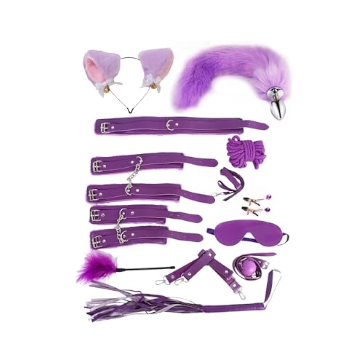 12 Pcs Bdsm Kit, Bondage Restraints Set Anal Butt Plug Tail Cat Ear Nipple Clamps Blindfold Handcuffs Collar Paddle Sex Toys For Couple Purple