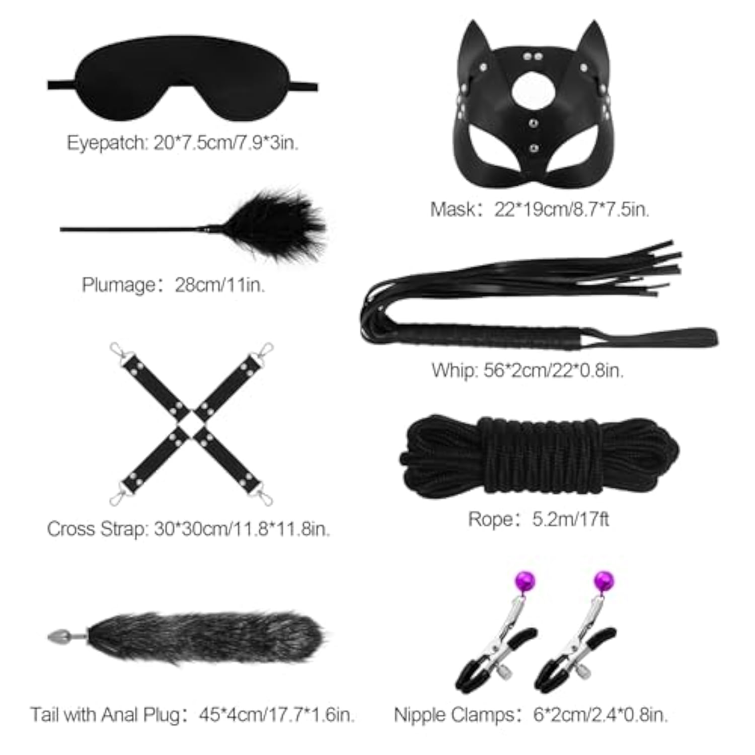 | Bondage Restraints Kit -- 12 Pieces Bdsm Set, Including Collar With Pulling Belt, Handcuffs, Ankle Cuffs, Tail With Anal Plug, Nipple Clamps, Ball Gag, Feather Tickler, Eyepatch, Mask, Cotton Rope, Cross Strap And Whip, These Couples Sex Set Are Adjustable, Suitable For Both Men And Women. | | Safety Material -- The Restrained Sex Toys Feature Quality Pu Leather And Fur, Soft And Comfortable Plush Lining For Safety And Durability, Which Can Protect Your Wrists And Ankles From Hurting. Upgraded Sm 12-In 1 Suit To Give You More Sexual Pleasure. | | Design -- Exquisite Design With Fluff Lining In Handcuffs, It'S Perfect For Restraining Either Wrists Or Ankles. Fits For Both Men And Women, Helping You Ensure That Your Lover Will Not Run Away And Make Them Restrained And Look Sexy. To Satisfy Your Erotic Desire, You Can Stroke Your Partner'S Body When He Or She Is Bounded By This Faux Leather Handcuffs. | | Multiple Uses -- Can Be Used For Cosplay, Living Room, Sofa, Kitchen, Balcony And Other Bondage And Discipline, Control And Obedience, Dominance And Submission. Eagle, Puppy, Butterfly, Missionary And Oral Sex Position, You Can Explore A New World With This Bdsm Sex Toy. | | Great Gift -- This Bdsm Bondage Restraints Set Is A Great Gift For Your Lover, Binding Beginners And Sm Lovers, Which Can Promote Your Relation And Make You Happier. The Black Mask Add Some Mystery For Your Night, Brings You An Excellent Sexual Experience! | |