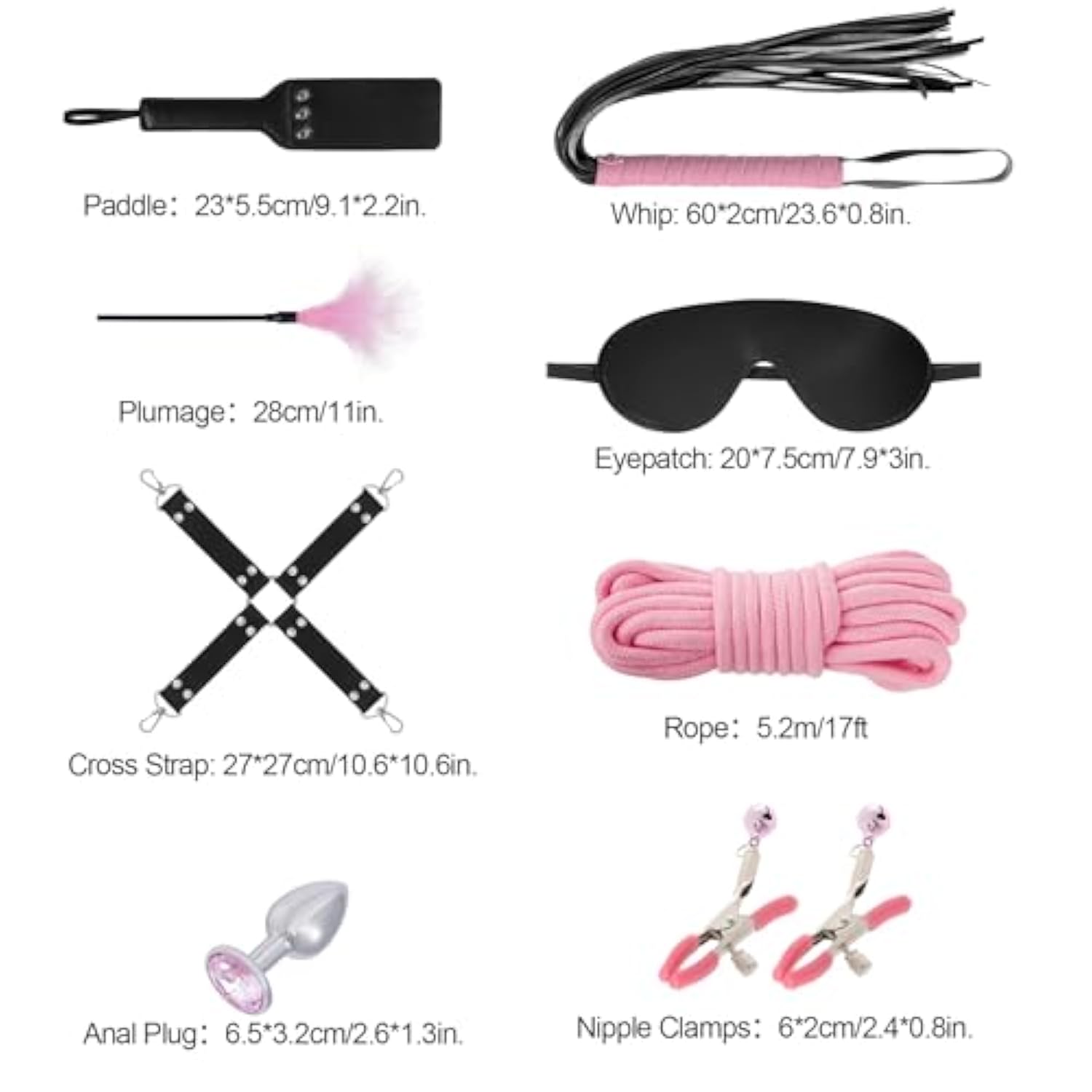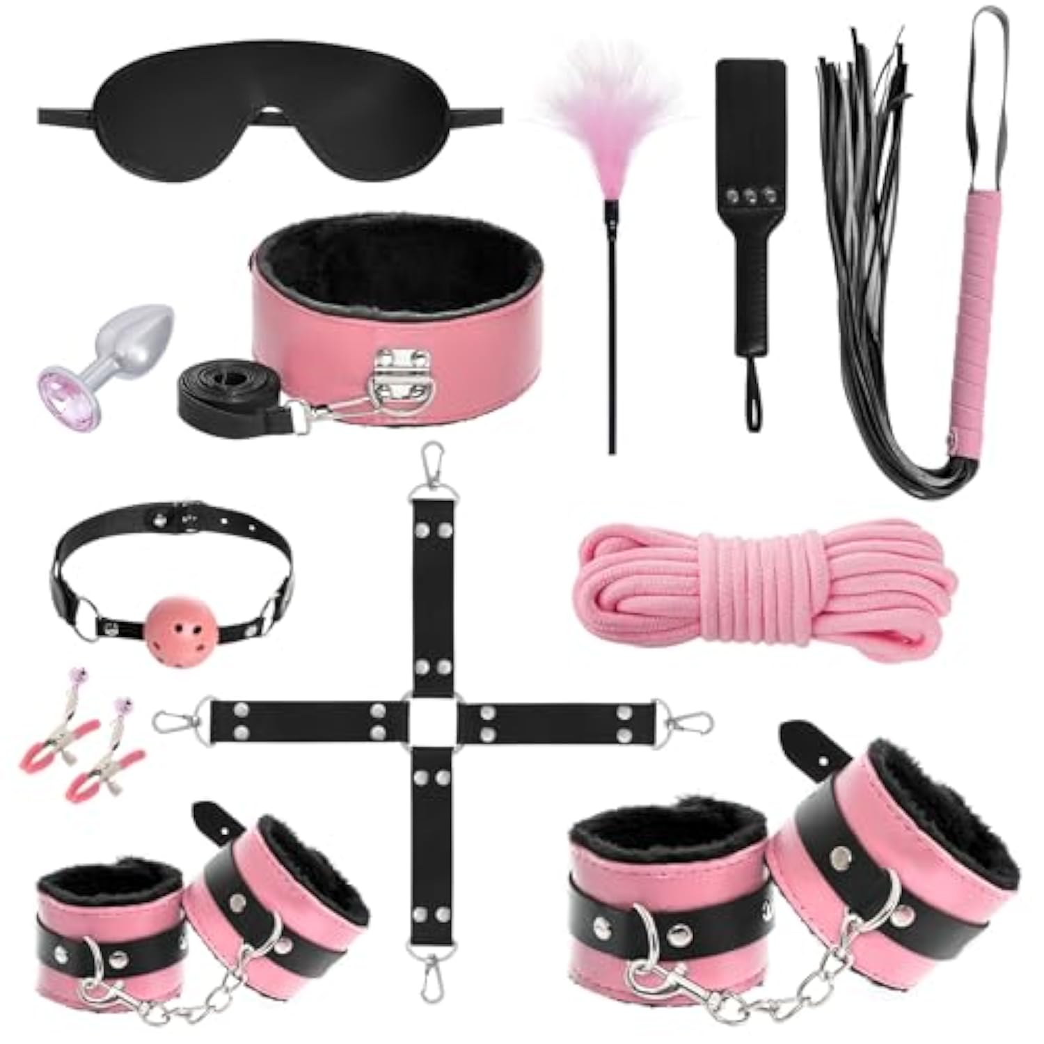 | Bondage Restraints Kit -- 12 Pieces Bdsm Set, Including Collar With Pulling Belt, Handcuffs, Ankle Cuffs, Anal Plug, Nipple Clamps, Ball Gag, Feather Tickler, Eyepatch, Paddle, Cotton Rope, Cross Strap And Whip, These Couples Sex Set Are Adjustable, Suitable For Both Men And Women. | | Safety Material -- The Restrained Sex Toys Feature Quality Pu Leather And Fur, Soft And Comfortable Plush Lining For Safety And Durability, Which Can Protect Your Wrists And Ankles From Hurting. Upgraded Sm 12-In 1 Suit To Give You More Sexual Pleasure. | | Design -- Exquisite Design With Fluff Lining In Handcuffs, It'S Great For Restraining Either Wrists Or Ankles. Fits For Both Men And Women, Helping You Ensure That Your Lover Will Not Run Away And Make Them Restrained And Look Sexy. To Satisfy Your Erotic Desire, You Can Stroke Your Partner'S Body When He Or She Is Bounded By This Faux Leather Handcuffs. | | Multiple Uses -- Can Be Used For Cosplay, Living Room, Sofa, Kitchen, Balcony And Other Bondage And Discipline, Control And Obedience, Dominance And Submission. Eagle, Puppy, Butterfly, Missionary And Oral Sex Position, You Can Explore A New World With This Bdsm Sex Toy. | | Great Gift -- This Bdsm Bondage Restraints Set Is A Great Gift For Your Lover, Binding Beginners And Sm Lovers, Which Can Promote Your Relation And Make You Happier. The Black One Can Add Some Mystery For Your Night; The Red Is So Charming And Sexy That You Cannot Control Yourself; The Pink Is Full Of A Romantic Atmosphere, The Purple Gives You A Charming And Mysterious Feeling, Which Brings You An Excellent Sexual Experience! | |