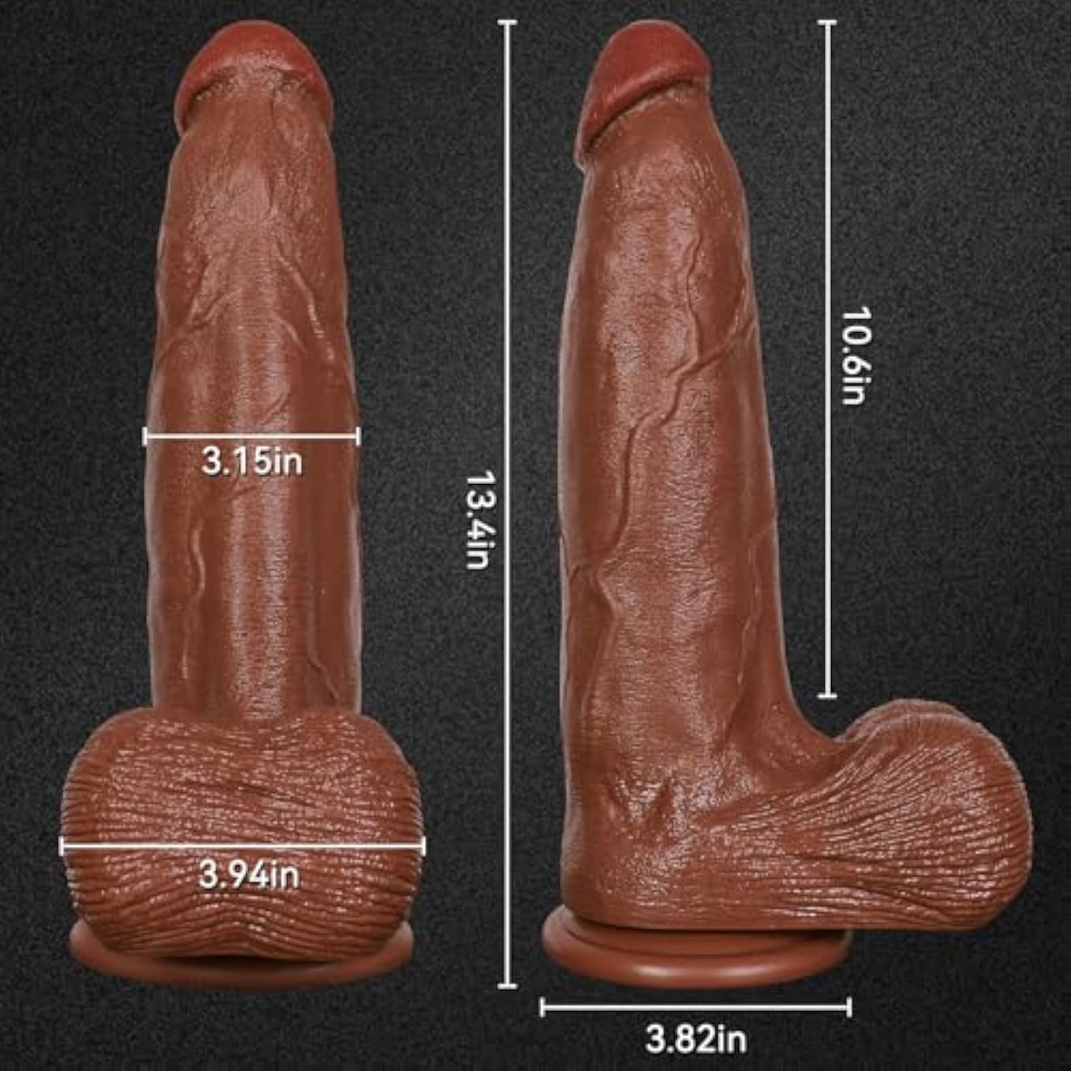 | ?Huge Size Design For Deep Pleasure Exploration?This Sex Toy Has A Total Length Of 13.4 Inches, An Insertable Length Of 10.6 Inches, A Maximum Diameter Of 3.15 Inches, A Balls Section Diameter Of 3.94 Inches And A Bottom Suction Cup Diameter Of 3.82 Inches. The Huge Size Brings A Full And Intense Stimulation Experience, Designed For Advanced Users Who Are Looking For The Ultimate Pleasure! | | ?Highly Simulated Structure Realistic Touch Reproduction?This Huge Dildo Is Built With Fine Molds, With Realistic Glans, Sinews And Three-Dimensional Texture Structure, Balls Full And Thick, Modeling Restore The Real Male Physiological Structure. The Combination Of Size And Detail Brings Strong Visual And Tactile Double Pleasure. | | ?Powerful Suction Cups On The Bottom?Equipped With A 3.82-Inch Diameter Solid Suction Cup Base, Can Be Firmly Adsorbed On Tiles, Glass, Wood And Other Smooth Surfaces, Hands Free, Easy To Try The Bathroom, The Floor, The Edge Of The Table, And Other Angles, To Unleash A Variety Of Body Position Play. | | ?High Quality Pvc Material Flexible And Safe?Made Of Soft And Solid High-Grade Pvc Material, With A Full Handfeel, Similar To The Touch Of Real Skin. The Material Is Odorless, Easy To Clean, Safe To Use, And Compatible With All Water-Soluble Lubricants To Meet The Needs Of Long-Term Use. | | ?Discreet Packaging Excellent