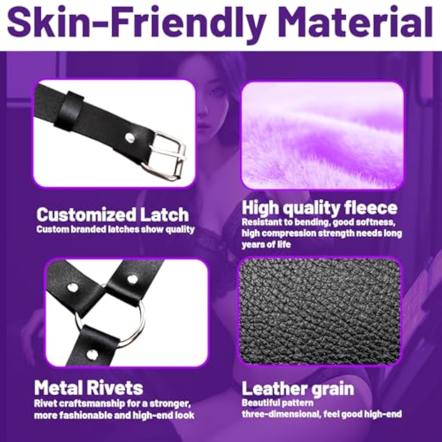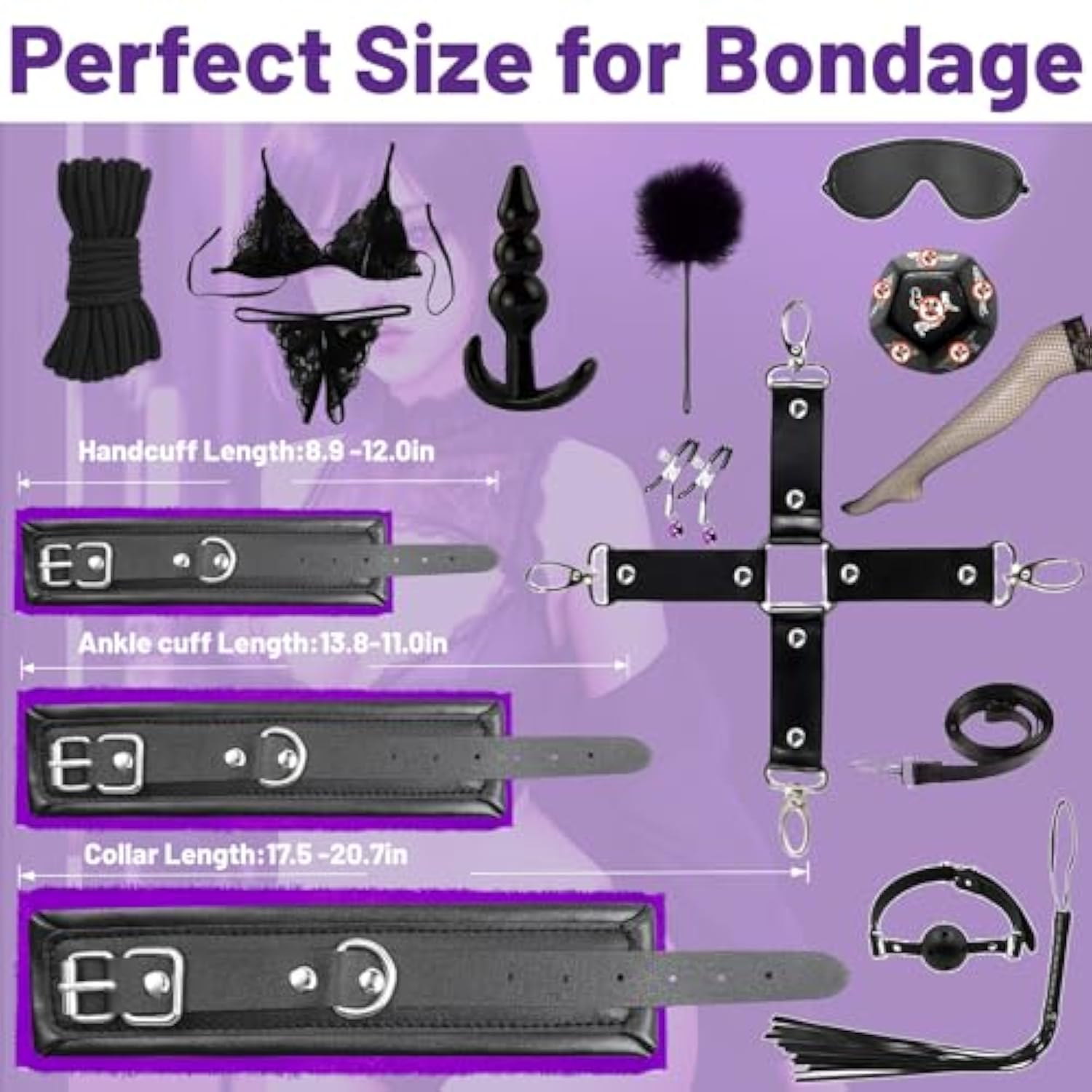 | More Ways To Foreplay 15 Pcs - This Sex Bondage Kit Consists Of 11 Accessories In Total (1X Restraint Belt, 2X Paddles, 2X Ankle Cuffs,2X Handcuffs 1X Blindfold, 1X Feather Tickler,1Xtraction Rope Send A Storage Bag,Light Soft Sexy Eyepatch, Black Whips), Those Couples Sex Set Are Adjustable, So It Can Fit Almost All People Size.Made Of Superior Leather And Nylon Material, Safe And Comfortable. | | Fully Hemmed Smooth Material - Our Restraints Sex Toys Are Perfect For Restraints Sex Beginners. The Outer Leather Material Of The Bondage Cuff And Collar Is Strong And Are Lined With Very Soft, Plush Material That Does Not Hurt The Wearer But Really Comfortable And Safe-She/He Has No Other Choice Except To Squirm In Pleasure!Upgraded Sm Eleven-In-One Suit To Give More Sexual Pleasure. | | Erfect For Restraints Sex Beginners - The Outer Leather Material Of The Bondage Cuff And Collar Is Strong And Are Lined With Very Soft, Plush Material That Does Not Hurt The Wearer But Really Comfortable And Safe-She/He Has No Other Choice Except To Squirm In Pleasure! | | The D-Rings Attach To Golden Chains That Can Be Used To Restrain Your Submissive Or Walk Your Pet. Feel Free To Attach Other Things To Them As You See Fit! Linked By Swivel Lobster Clasps, These Secure, Lightly Padded Restraints Make A Sensual, Nonintimidating Addition To Sm Play. Being Tied Up Has Never Been So Comfy! | | Discreet Packages And After Sales - Dedicated Sealed Box And Wrap The Product In An Opaque Bag To Protect Your Privacy. You Can Rest Assured That As A Gift. Enjoy Your Shopping And Have A Good Day! If You Have Any Questions About The Toy, Please Feel Free To