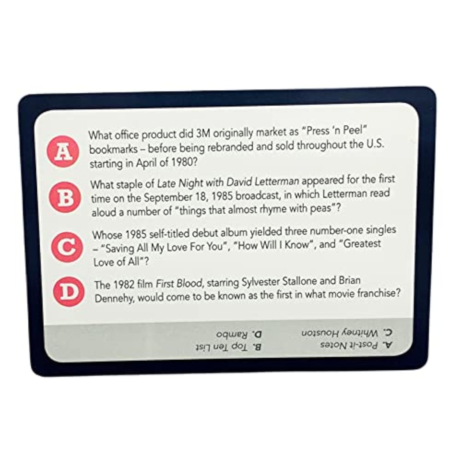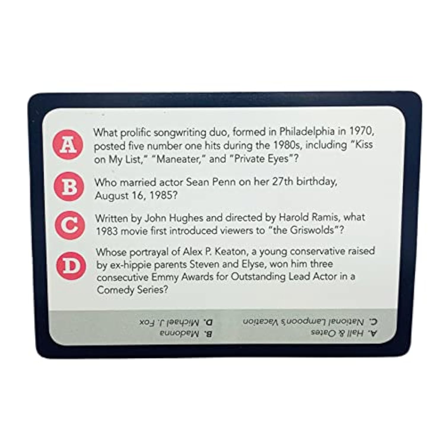 Step back in time and relive the iconic decade with the 1980s Trivia Game, the ultimate pop culture and nostalgia quiz for adults, teens, and retro enthusiasts! Packed with fun, challenging questions about music, movies, TV shows, fashion, and events from the 1980s, this game is perfect for family game nights, parties, or friendly competitions. Designed for 2 or more players, it encourages quick thinking, memory recall, and friendly rivalry, making it a hit for both casual and serious trivia fans. Compact, easy to play, and highly engaging, it’s ideal for home gatherings, social events, or retro-themed parties. Perfect as a gift for 80s lovers, trivia enthusiasts, or party hosts, the 1980s Trivia Game guarantees hours of laughter, nostalgia, and interactive fun. Celebrate the decade of neon, big hair, and unforgettable hits with this ultimate retro trivia experience!