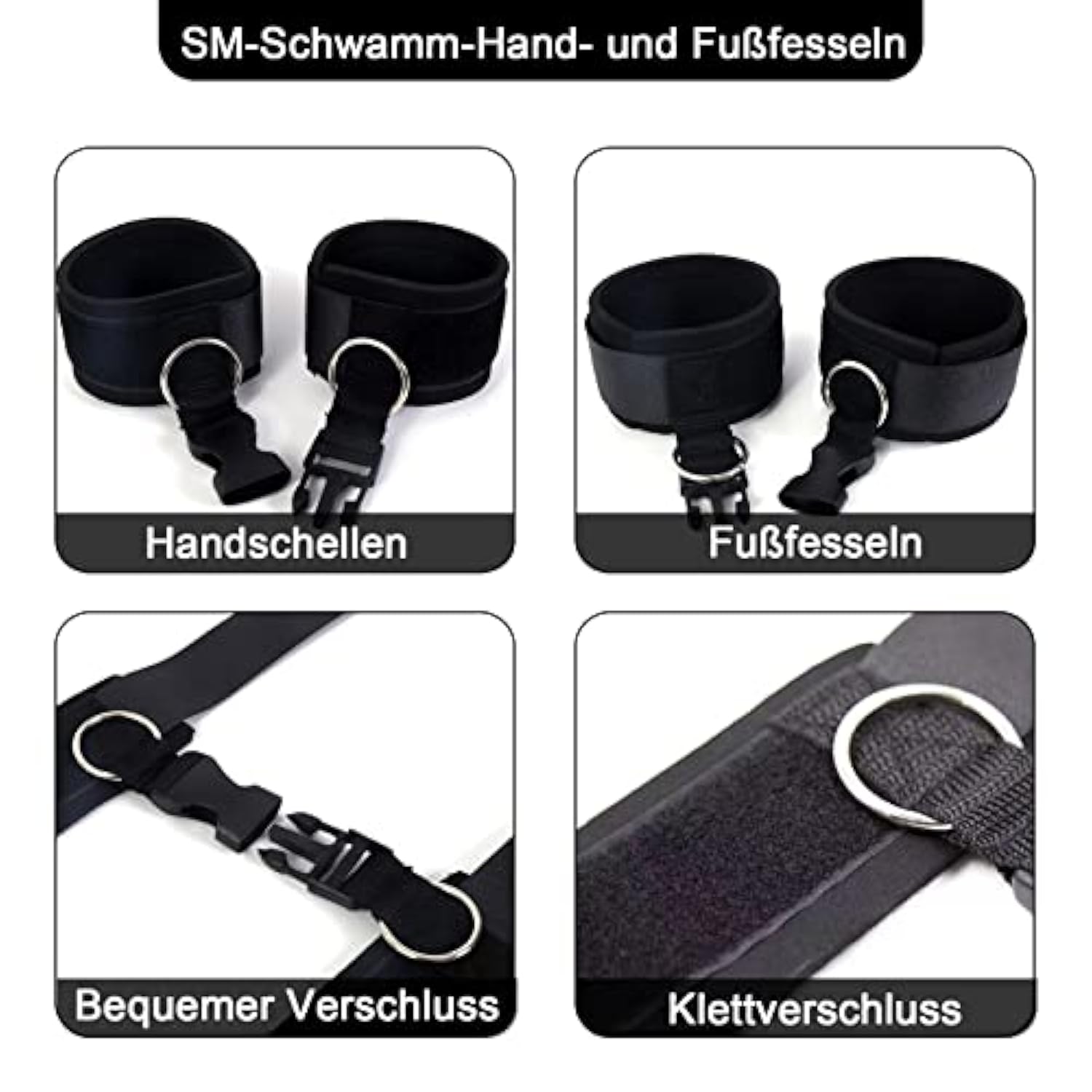 | ?Quality Material --These Are Made Of High Quality Sponge And Nylon Fabric, Soft, Safe, Non-Toxic And Durable. Will Not Cause Allergy To The Skin. | | ?Easy To Use-- Velcro Fasteners Allow The Cuffs To Be Individually And Perfectly Adapted To The Wrists, And With A Simple Movement The Hands Are Tied Up Without Irritation. | | ?Enjoy Your Passion-- Sm Sex Games You Can Now Enjoy Anywhere With Your Partner. Whether In The Bedroom, In The Kitchen, On The Mattress, On The Sofa Or Even On A Chair, Wherever You Want! Hunt More Excitement With Your Partner! | | ?Light And Easy To Carry--This Bondage Set Is Lightweight, Easy To Carry And Easy To Use. It Is Ideal For Travel, Hotels And Other Occasions. The Perfect Bdsm Sex Toy For Men And Women, Couples, Lovers And Homosexuals. | | ?Perfectly Compatible With Other Sm Tools--When You Tie Up Your Partner, You Can Use A Range Of Sm Products Such As Whips, Paddles, Nipple Clamps, Gags, Anal Plugs, Dildos, Clitoral Vibrators And More. In This Way, The Sexual Stimulation Of The Bondage Is Intensified. | |