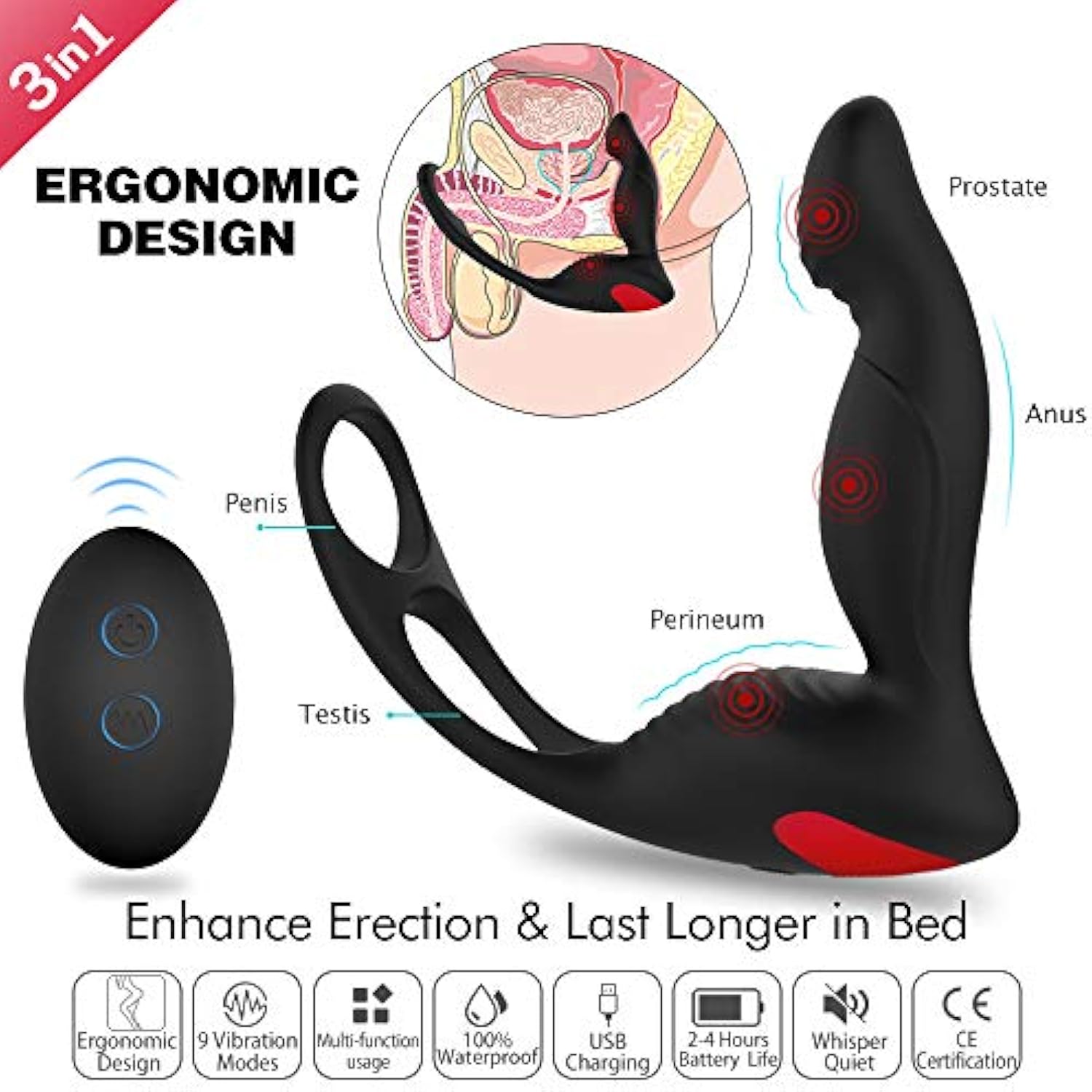 3-In-1 Remote Control Prostate Massager Vibrator With Penis Ring And Ball Loop, 9 Speeds Rechargeable Anal Sex Toy Waterproof G-Spot Vibrating Stimulator For Men Women Couple