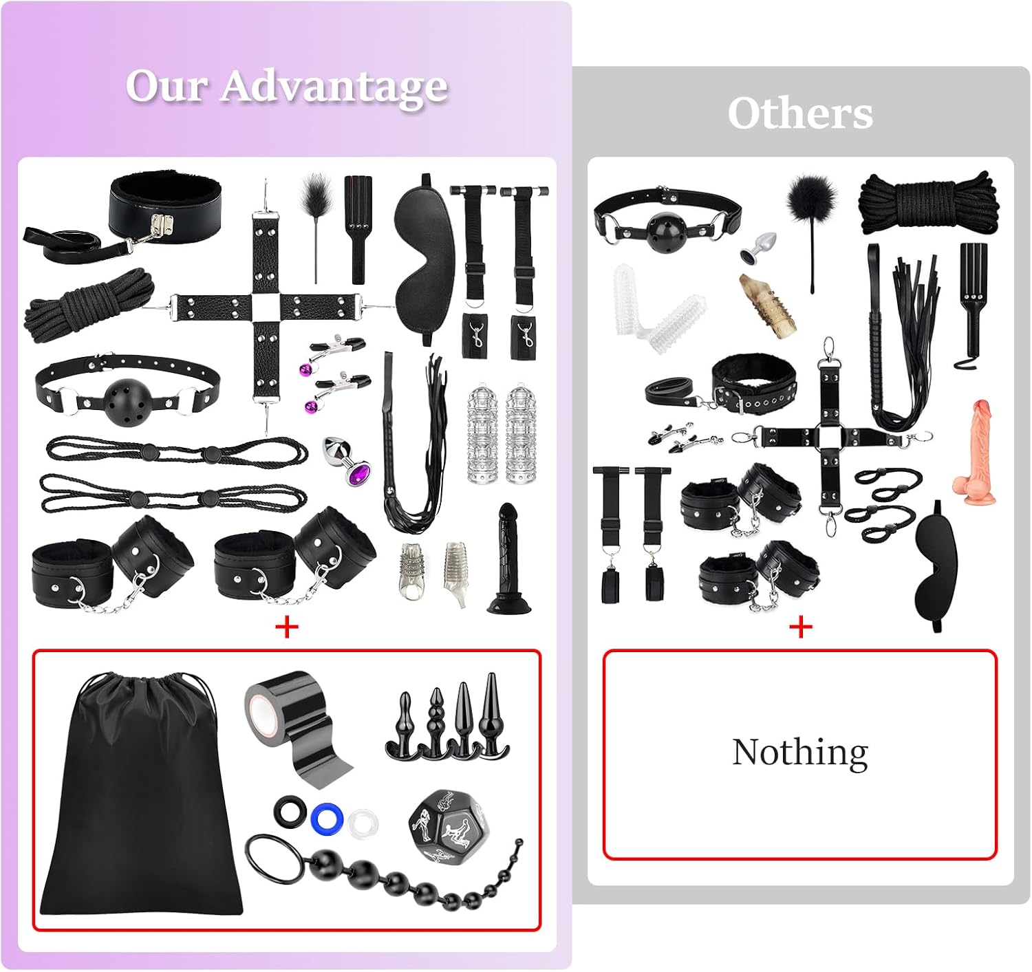 36-Piece Bondage Set: Includes a variety of accessories such as handcuffs, ankle cuffs, nipple clamps, traction rope, neck restraint ring, ball gag, anal toys, flogger, feather teaser, eye mask, cross strap, tape, dice, sex rope, paddle, metal anal plug, bondage rope, penis rings, finger sleeves, penis enlargement sleeves, dildo, door hanging sex swing, and a discreet storage bag for convenience.