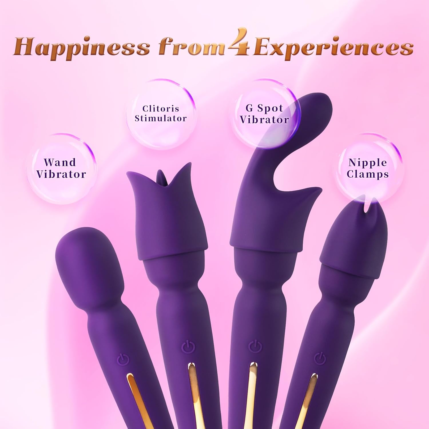4-in-1 Wand Vibrator Kit – Ultra-Quiet Toy with 3 Attachments & 10 Modes