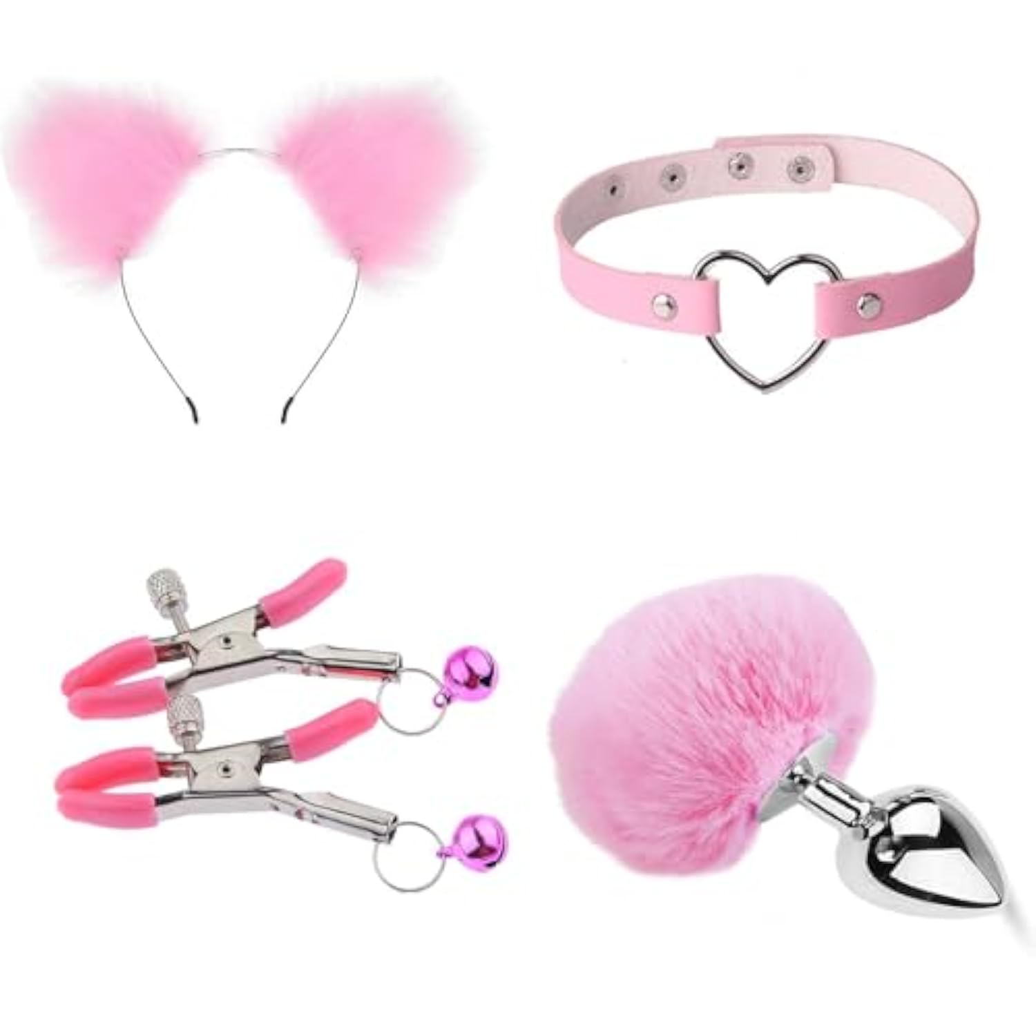 4-Piece Anal Plug Set With Bunny Tail Stainless Steel Butt Plug, Faux Fox Cat Ear Headband Hair Hoop, Heart Leather Bondage Choker And Body Ring Nipple Clamps With Bells For Adults Women Couples