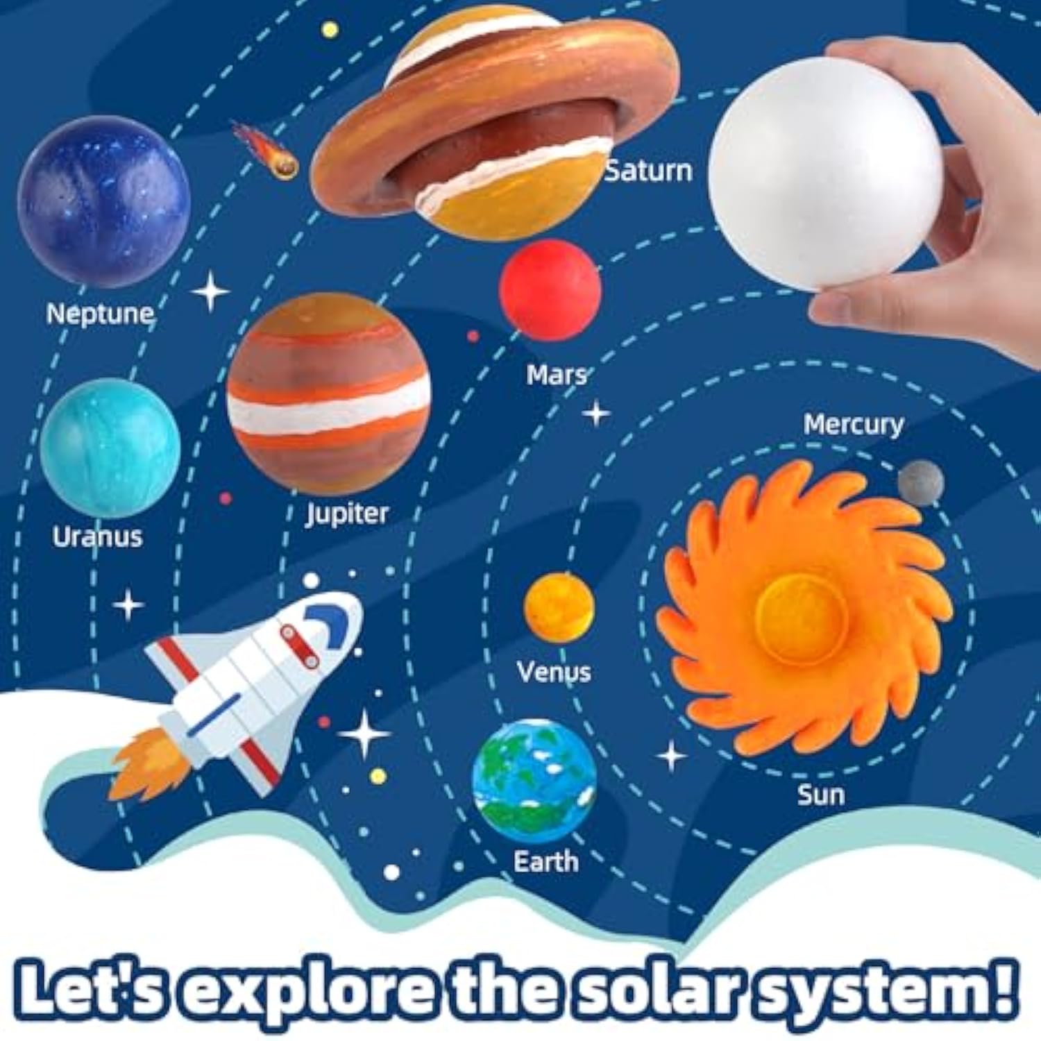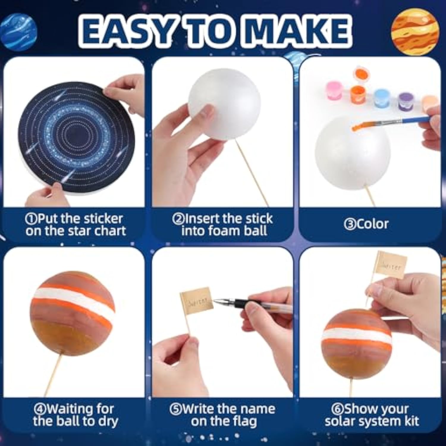 | ?Set Content?The Solar System Kit Includes 7.87 Inches Of Foam Discs, 1 Sun, 12 Foam Balls Of Different Shapes, 4 Foam Stars, 15 Bamboo Sticks 15 Toothpick Flags, 12 Colors, 2 Brushes, 1 Palette, 1 Instruction. The Solar System Model Kit Provides Everything Kids Need To Carry Out Solar System Projects, Kids Can Easily Start Solar System Projects In School Or At Home! | | ?Space Enlightenment?The Solar System Model Kit Allows Kids To Color And Build Their Own Solar System Model, Providing Kids A More Intuitive Understanding Of The Planet In The Solar System. With A Solar System Instruction, Which Introduces Kids To The Relevant Details Of The Solar System, Sparking Their Curiosity And Desire To Explore Astronomy And Science! | | ?High Quality?The Solar System Science Kit For Kids 3-5 Is Made Of Durable Polystyrene Foam With A Smooth Surface That'S Easy To Color, And Includes 12 Acrylic Paints, Which Are Safe And Odorless. Kids Can Use Their Imagination To Create The Planets Of The School Solar System Project! | | ?Learning By Playing?The Solar System Project Kit Helps Kids Build Skills Through Fun. Creating Planets Not Only Improves Kids Hand-Eye Coordination And Focus, But Also Boosts Their Scientific Knowledge And Artistic Skills. | | ?Wide Application?The Solar System Kit Is Perfect For Themes And Activities About The Solar System And Planets. It’S Great For Enhancing Classroom Learning About The Solar System And Also Makes A Fun Family Activity. | |