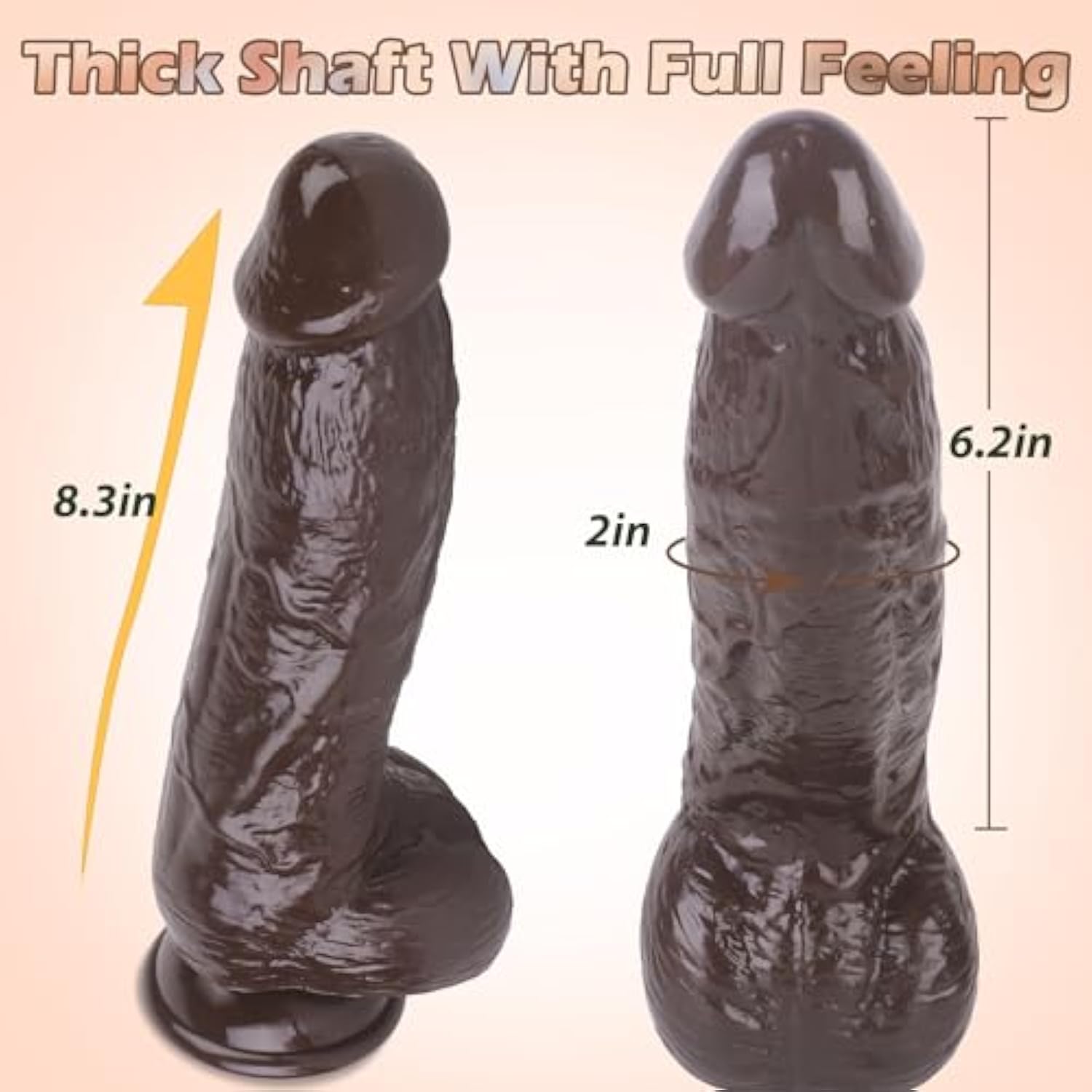 - Total Length: 8.3 Inches.Thick Shaft With Full Feeling .The Diameter Of This Big Dildo Is 2 Inches, With 6.2 Inches Insertable Length! It Provides Realistic Feelings And Deep Penetration To Stimulates Internally!The Decent Length And Girth, This Dildo C