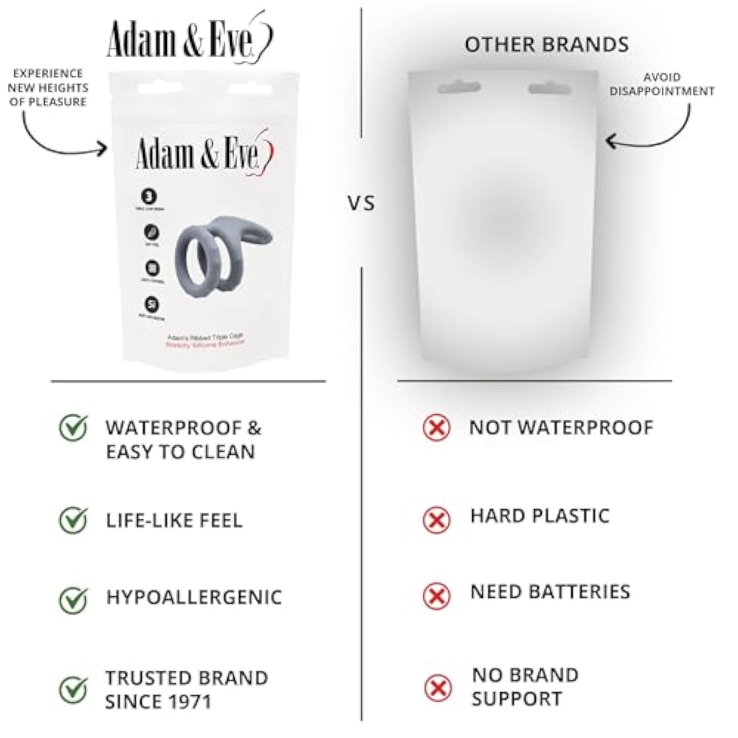 | Triple Loop Design For Maximum Performance: Unlock New Levels Of Pleasure With Adam’S Silicone Triple Cage, Featuring 3 Snug Loops To Enhance Erection Hardness, Staying Power, And Size. Perfectly Engineered To Elevate Intimacy, This Cage Supports Ultimate Satisfaction For Both Partners. | | Stimulating Ribbed Silicone For Thrusting Fun: Enhance Every Thrust With Ribbed Loops That Provide Exciting External Stimulation For Your Partner. Designed To Intensify G-Spot And P-Spot Pleasure, These Ribs Deliver A Heightened Experience With Every Movement. | | Comfortable Hypoallergenic Material: Crafted From Premium Body-Safe Silicone, This Triple Cage Ensures A Soft, Snug, And Stretchy Fit. Hypoallergenic And Non-Toxic, It’S Designed For Long-Lasting Wear And Ultimate Comfort. Easy To Clean For Hassle-Free Use. | | Performance-Boosting Support: The Bottom Loop Secures The Cage Around Your Shaft And Balls For Prolonged Play And A Natural Confidence Boost. Dual Shaft Loops Enhance Blood Flow, Keeping You Harder For Longer And Adding Noticeable Girth To Every Encounter. Use With Water-Based Lubes Only. | | Trusted Usa Brand Since 1971: Adam Eve Is Committed To Providing High-Quality Products And Exceptional