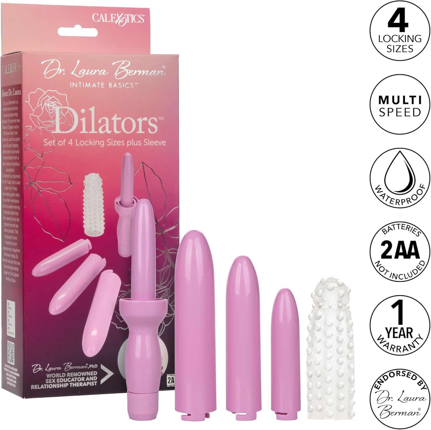 Multi-speed vibrating dilator designed for both comfort and pleasure during training. Includes three interlocking dilating sleeves for customizable girth selection, along with a soft universal sleeve for added comfort. The universal sleeve stretches to fit each attachment size for a personalized experience. Created by women for women and endorsed for quality. Requires 2 AA batteries (not included). Backed by a 1-year manufacturer warranty.