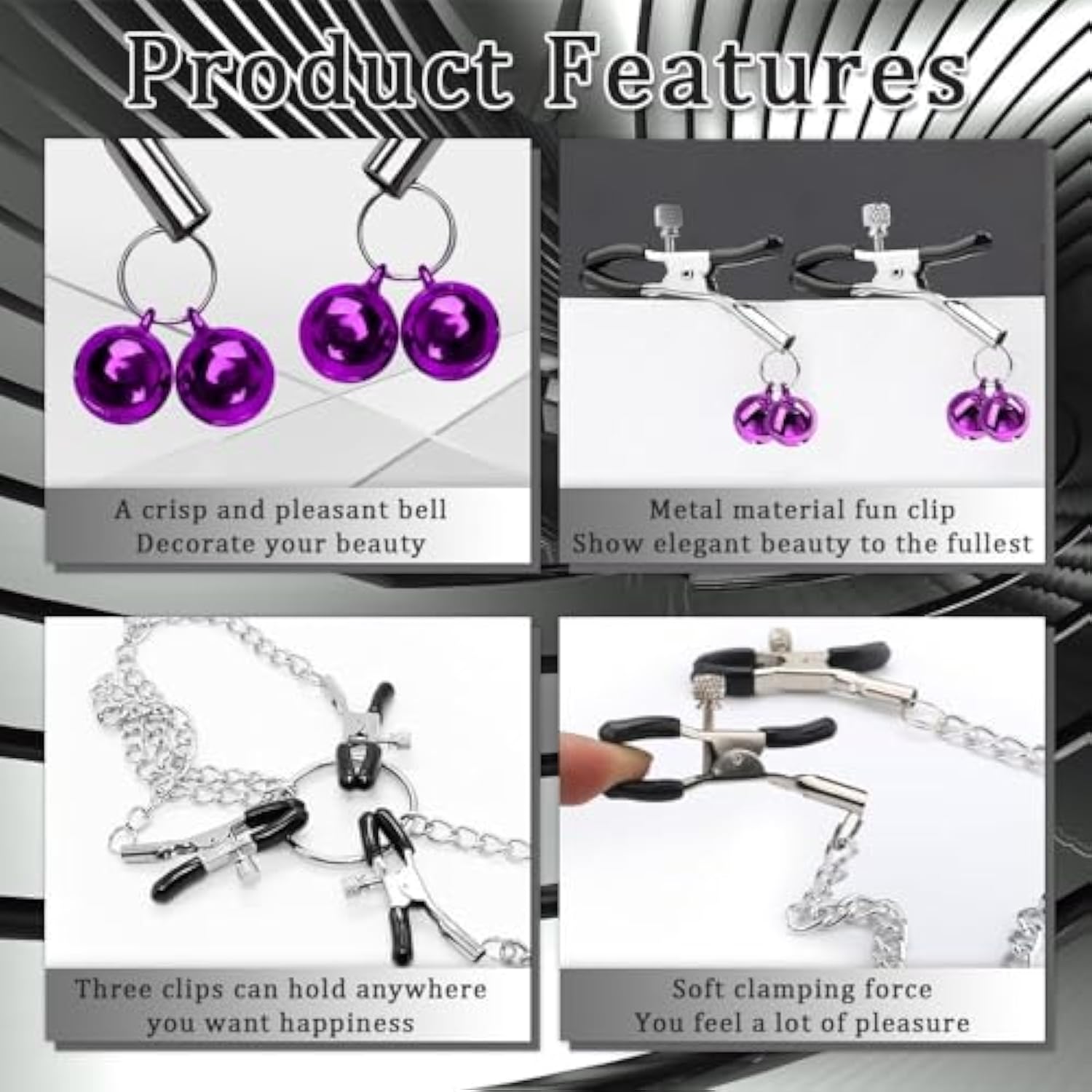 | Comfortable Nipple Clamps: These Nipple Clamps Are Designed With Metal Clips Encased In A Rubber Shell, Providing A Gentle Pinching Sensation Without Scratching Your Skin The Rubber Shell Is Super Soft, Ensuring A Pleasant Experience | | Nipple Clamp Design: The Clitoral Clamp Has 3 Clips With Chains To Hold The Nipples And Clitoris, And 2 Clips With Bells To Make You And Your Lover Even More Passionate When The Bells Make A Crisp Sound | | Nipple Clamps With Bells: Adjustable Nipple Clips Clamps, Have You To Explore Slowly And Try With Different Type Of Loves In Its Stimuli, It Will Take You Into A World You Never Imagined Increase The Couple'S Interest. | | Easy To Use: Non-Piercing Adjustable Metal Nipple Clamps With Chain, Comfortable To Wear, Not Easy To Fall Off | | Easy To Carry: Nipple Clamps Are Small, Light And Easy To Carry, And Can Massage The Nipples | |