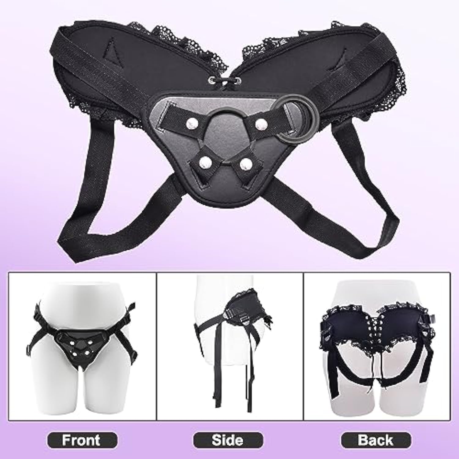 Adjustable Strap On Harness, Plus Size Strapon Harness For Women, Strapless And Wearable Dildo Harness, With 5 Different Sized O-Rings, Elegant Lace Ruffle Back Panel, Maximum Waist 52"