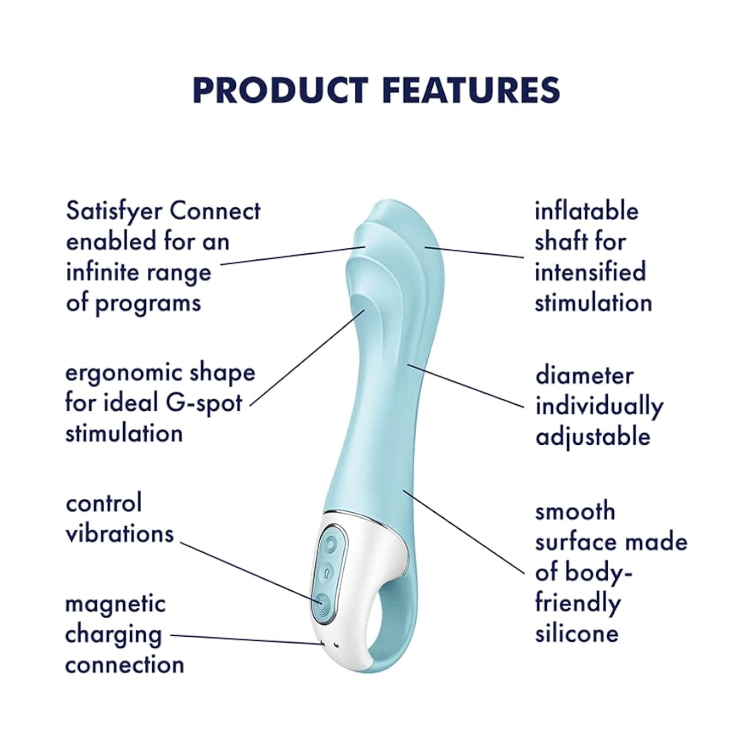 G Spot Stimulation - 12 Vibration Programs Coupled With A Voluminous Shaft With A Wide, Rounded Tip Make This Vibe Perfect For G-Spot Stimulation, Bringing You To The Most Divine Climaxes. | | Adjustable Diameter - The Tip Of The Shaft Can Be Inflated Step By Step At The Touch Of A Button, Increasing The Diameter By Up To 15Mm In Just 12 Seconds. | | Free App Control - With The Free Connect App, Available For Ios And Android, Turn Your Phone Into An Intuitive Remote For Your Air Pump Vibrator. Simply Connect Your Toy Via Bluetooth And Get Ready To Experience The Endless Options Our App Has To Offer. | | Body-Friendly Silicone - The Air Pump 5+ Vibrator Is Made With Body-Friendly Silicone, Making It Soft To The Touch For Added Comfort And Easy Cleaning. | | Ergonomic Shape - The Ergonomic Shape Of The Air Pump 5+ Vibrator Allows For Precise And Targeted G-Spot Stimulation. | |