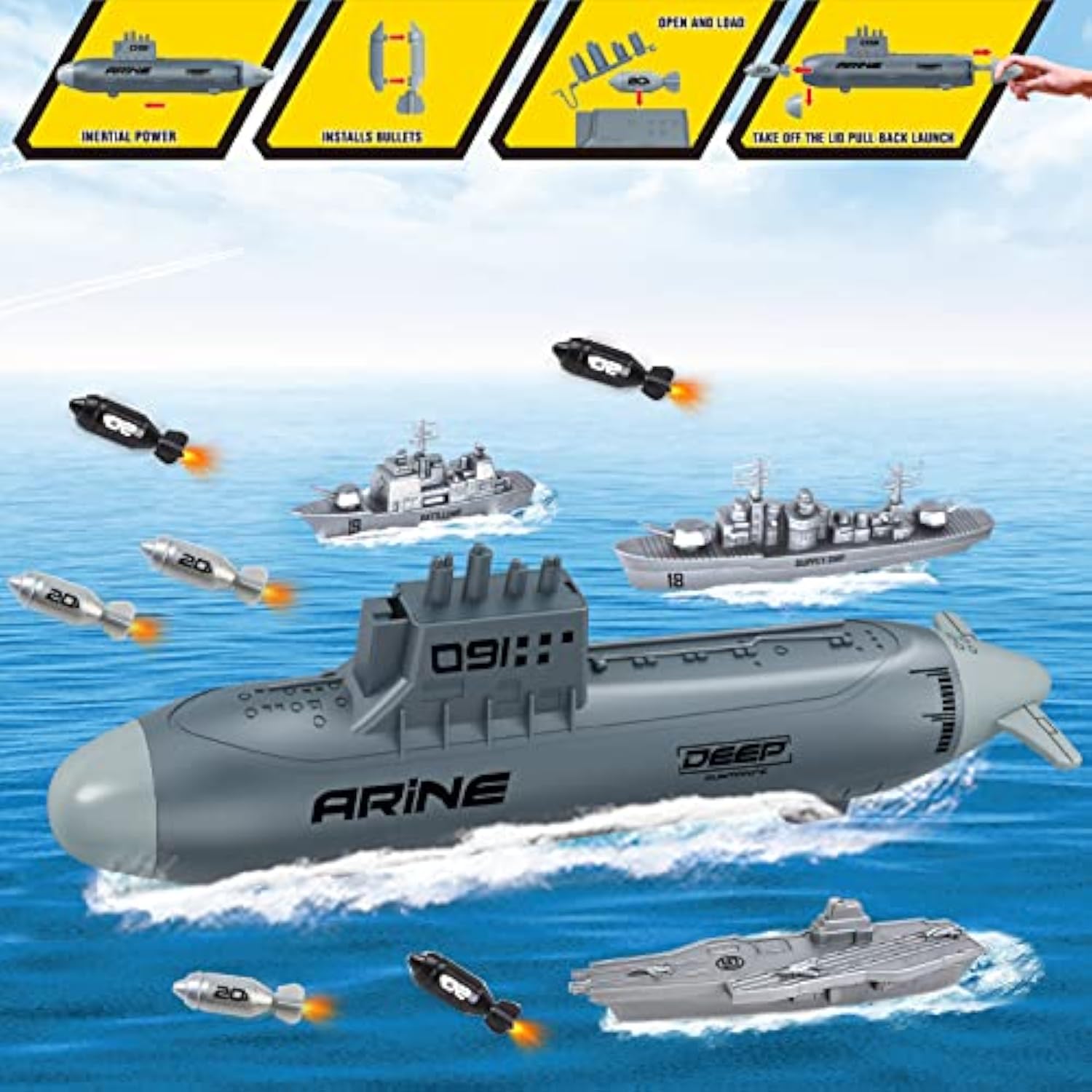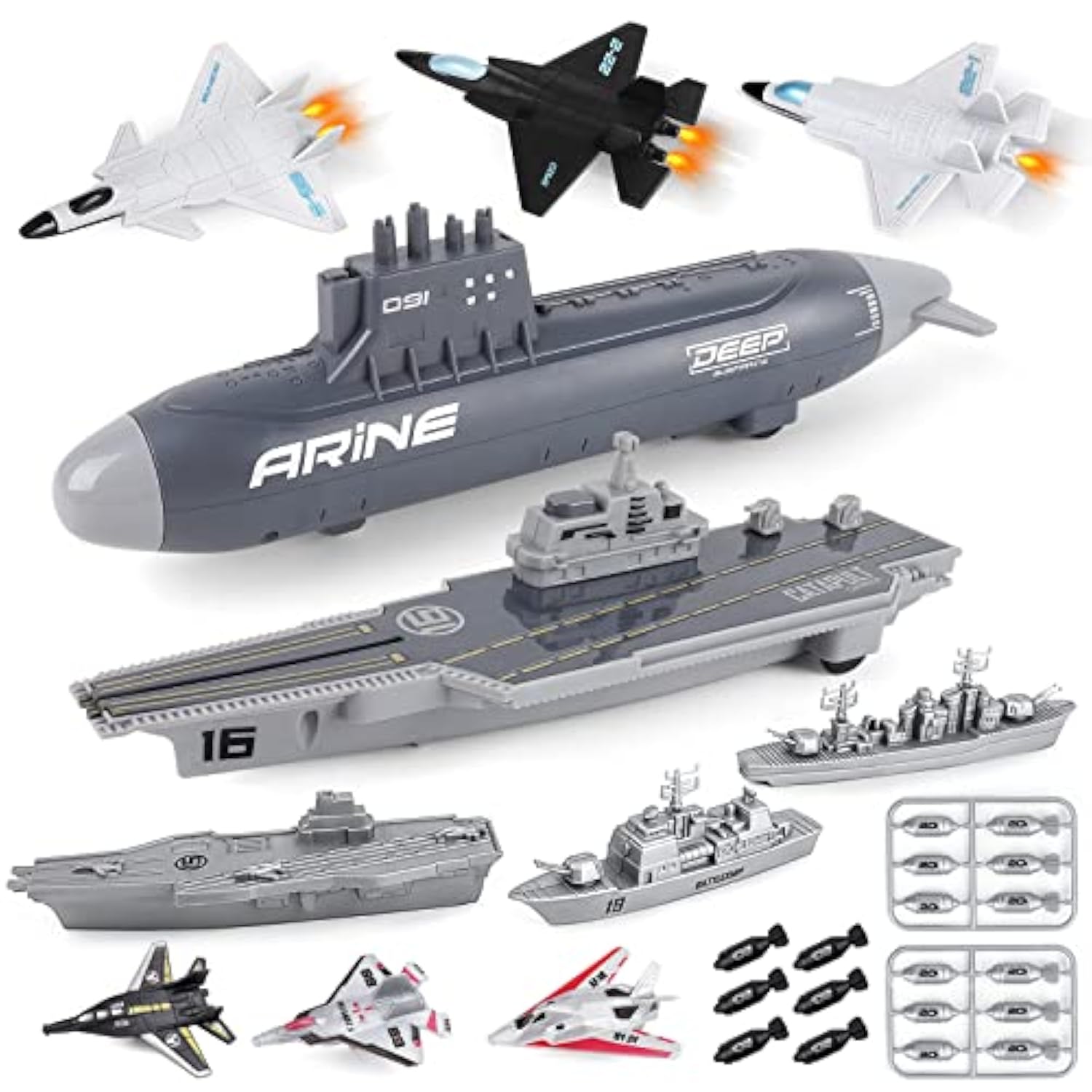 | Aircraft Carrier Play Set:This Set Includes A Submarine Toy, A Big Aircraft Carrier Three Battleships And Six Fighter Planes,Creating This Play Set A Fantastic Add On To Your Little One'S Military Toy Collection Or The Perfect Gift For A Beginner. | | Pull-Back Function: Our Submarines And Airplanes Have Inertial Power And A Pull-Back Function. No Need Battery?Just Give A Gentle Pull Back And Release, And They Will Glide Forward At Speed. | | Simulation Submarine Model: Pull The Tail Of The Submarine, You Can Launch The Toy Missiles Out, Very Interesting And Fun. | | Benefits: This Play Set Is Fantastic For Hand-Eye Coordination And Developing Imagination. Your Little One Is Also Able To Develop An Understanding Of Aircarft Carrier And Planes Through Play. Perfect To Add In Your Child’S Toy Collection. | | Ideal Gift: Made Of High Quality And Child-Friendly Abs Material With Smooth Burr-Free Edges, Non-Toxic, Odorless, Learning And Durable, Great Gift For 3+ Boys And Girls. | |