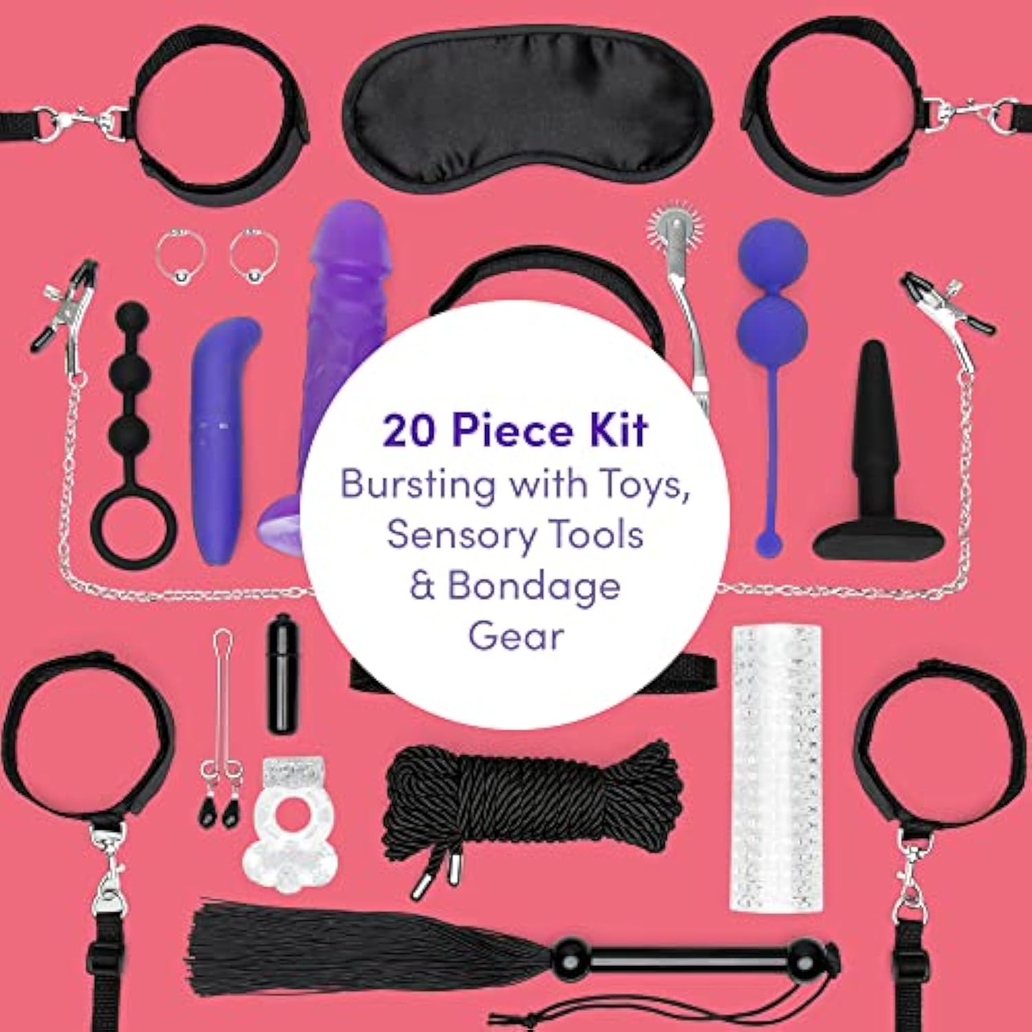 All You Need Bondage Kit - 20 Piece Bondage Set - Includes Blindfold, Flogger, Nipple Clamps, Vibrators, Anal Beads, Cock Ring And Much More - Sex Toys For Couples - Black/Purple