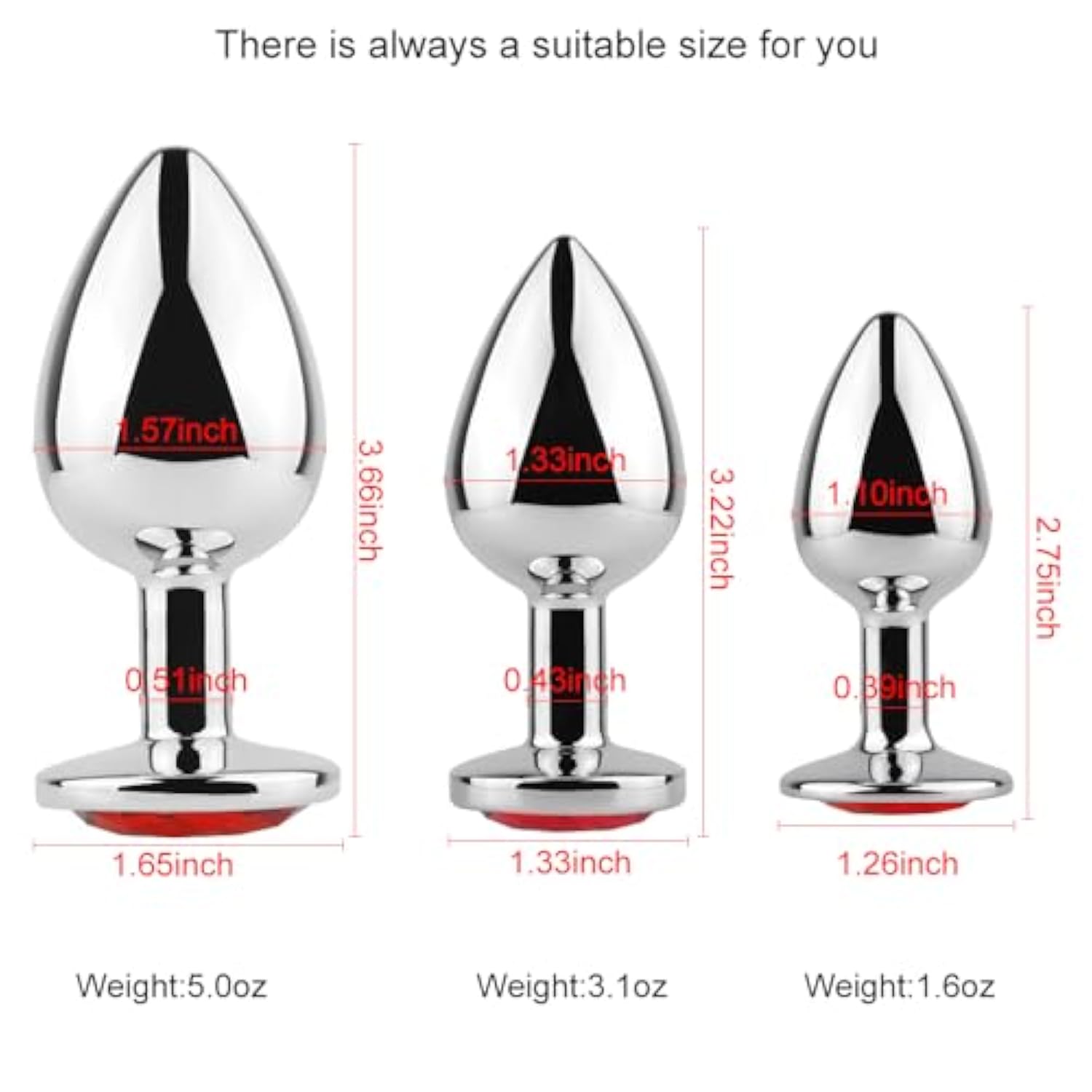 | Premium Material: Aluminum Alloy Made Anal Training Set, Safe And Environmentally Friendly, Non-Poisonous And No Odour, To Protect Your Happiness And Health.Optimal Glide Thanks To This Smooth Surface Of The Metal Adult Toy, It Is Easy To Insert Without Discomfort. | | Size: Comes In Three Sizes (Large:3.66Inch In Length And 1.57Inch In Diameter), (Medium: 3.22Inch In Length And 1.33Inch In Diameter), (Small: 2.75Inch In Length And 1.10Inch In Diameter). | | 3 Trainer Size: We Have 3 Available Size From Small To Big For Your Choice,A Good Set For Beginner To Train You Into An Expert,This Will Be A Wonderful Experience For Yourself To Explore.You Can Also Find The Right Size To Fit Your Own Demanding And Get To Your G-Spot. | | Fascinating Color And Red Jewel: The Plugs Have Beautiful Color And A Jewel On The Bottom To Spice Up Your Sex Time. Basement Is Big And Round To Avoid Plug Slide Inside And Idea For Long Time Wear, Flirting With Your Master While The Plug Is Full Inside Your Anus. | | Adult Sex Toy For Women And Couples: Our Jeweled Anal Plug Geart For Women Men,Suitable For Any Type Of Sex Game Alone, Beginners And Enthusiast.Anal Toys.Butt Plug Toy.Anal Plug Toy. Adult Toys.Butt Toys.Butt Sex Toys.Adult Toys Female.Adult Toy.Adult Sex Toys Woman.Anal Toys.Women Sex Toy.Sex Toy Kit.Adult Toy.Sex Toys Anal Training Set.Adult Toys For Womens And Couple.Women Sex Toy. | |