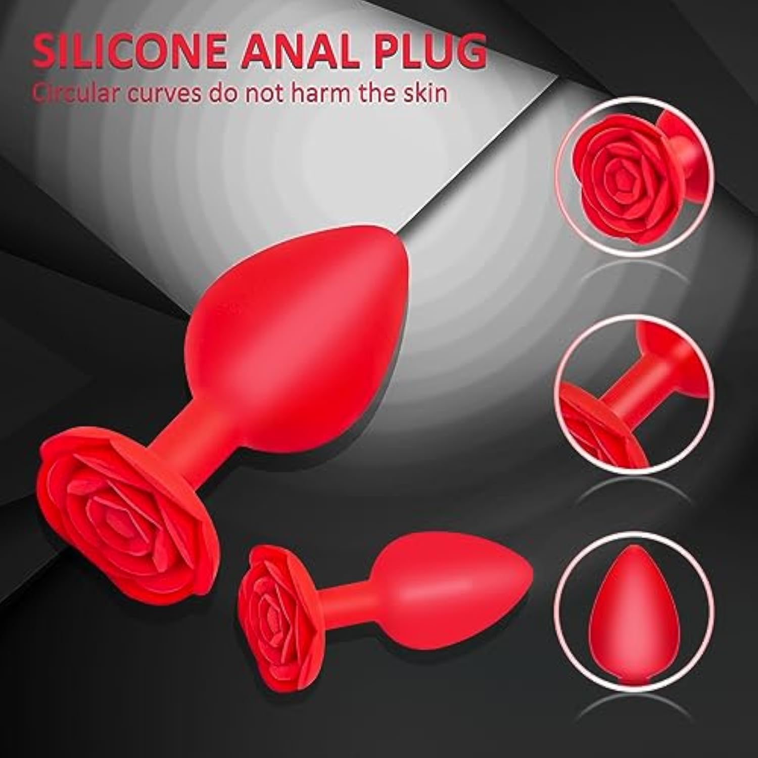 Anal Butt Plug Rose Sex Toy, 3Pcs Silicone Anal Plugs Training Set,Training Set With Flared Base Prostate Sex Toys For Beginners Advanced Users(Red)