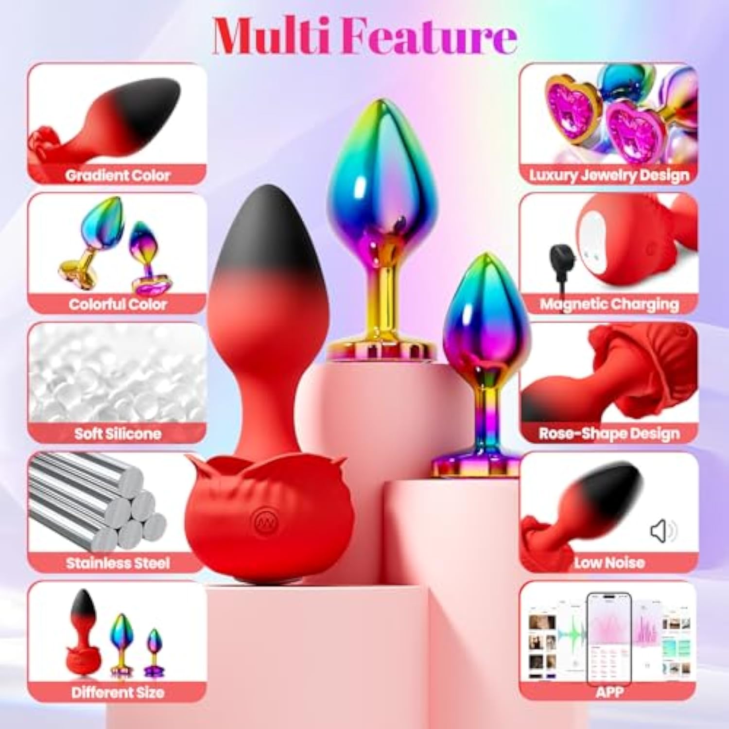 | 3Pcs Vibrating Butt Plug Set Anal Plug Training Kit: This Trainer Kit Contains 3 Anal Plugs In Different Sizes And Shape, Silicone Anal Plug With Stylish Rose-Shape Design And Colorful Stainless Steel Butt Plug With Hearts Jeweled Base. This Collection Caters To Every Level Of Pleasure Seeker. Progressive Sizes Encourage Safe, Comfortable Training | | 11 Vibrations: The Butt Plug Adult Toys Vibrating Anal Toys Has 11 Vibration. From Gentle To Intense Vibrations, It Gradually Stimulates Pleasure From The Anus To The Perineum To The G-Spot And Deepest Parts Of The Channel, Cascading Until You'Re Climbing To Sex Pleasure. Whether You'Re A Man Looking For Prostate Massager And Anal Stimulation, A Woman Trying Anal Sex For The First Time, Or A Couple Looking For Intimate Stimulation, This Versatile Adult Toy Is The Ideal Choice For A Multidimensional Sensual And Stimulating Experience. Vibrating Rose Anal Plug And Colorful Stainless Steel Butt Plug Combines Static Fullness With Thrilling Vibration | | Soft-Safe Silicone Anal Plug Stainless Steel Butt Plug: Large Vibrating Anal Plug Is Made From Ultra-Soft, Body-Safe Silicone That Feels Silky Smooth Against The Skin. The Small And Medium Anal Butt Plug Toys Are Crafted From High-Quality, Polished Stainless Steel With A Vibrant, Eye-Catching Finish. The Solid, Weighty Feel Of Metal Provides A Unique Sensation Ideal For Temperature Play — Simply Warm Them Up Or Cool Them Down For An Extra Thrill And The Rigid, Non-Flexible Structure Offers A More Solid, Intense Feeling Of Fullness And Pressure | | Elegant Rose-Shaped Base Stainless Steel Plug With Luxury Jewelry Design: Designed With A Beautiful Rose-Shaped Base, The Large Plug Isn’T Just Functional — It’S A Visual Treat. The Striking Red And Black Color Combination Adds An Extra Touch Of Elegance, While The Wide Base Ensures Safe, Worry-Free Play By Preventing The Toy From Slipping. Perfect For Those New To Anal Exploration, Small And Medium Plugs Base Is Decorated With Well-Made Heart Shape Jewellery, Feature Sleek, Smooth Finishes In Bright, Dazzling Colors. It’S Both A Piece Of Erotic Art And A Reliable Companion For Your Intimate Adventures | | App Controlled Anal Plug-Multiple App Features: It Not Only Has Recording, Music And Other Patterns Functions, But Also A Rich Collection Of Massive Video Functions And Diy Functions. It Can Meet The Needs Of Both Couples And Solo Users In Terms Of Richness. Different Styles Of Videos Can Create Immersive Experiences When Using The Product, And You Can Sync And Diy Your Own Mode. Wireless Control From Anywhere — Whether Playing Solo, With A Partner, Or Spicing Up Long-Distance Encounters. Customize The Rhythm And Intensity To Suit Your Mood And Desires In Real Time | | After-Sales Service Discreet Butt Plug: Our Adult Toy Prostate Massager Sex Anal Toys Butt Plug Vibrator For Women Are Shipped In A Discreet Package. We Value Our