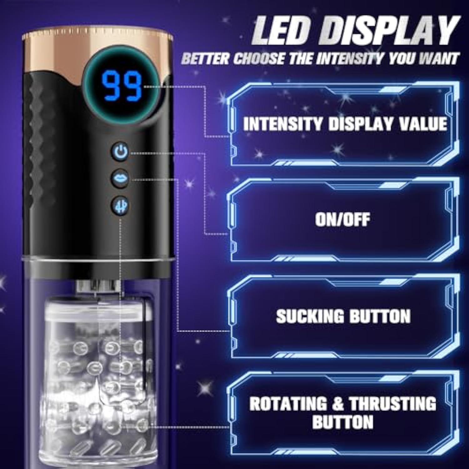 - ?3 In 1 Automatic Male Masturbator?This Male Masturbator Is Combined Thrusting, Sucking And 360° Rotating Stimulation Together For Multiple Ways To Play. Equipped With An Led Display, You Can Easily Know Which Gear You Are Currently In When You Adjust O