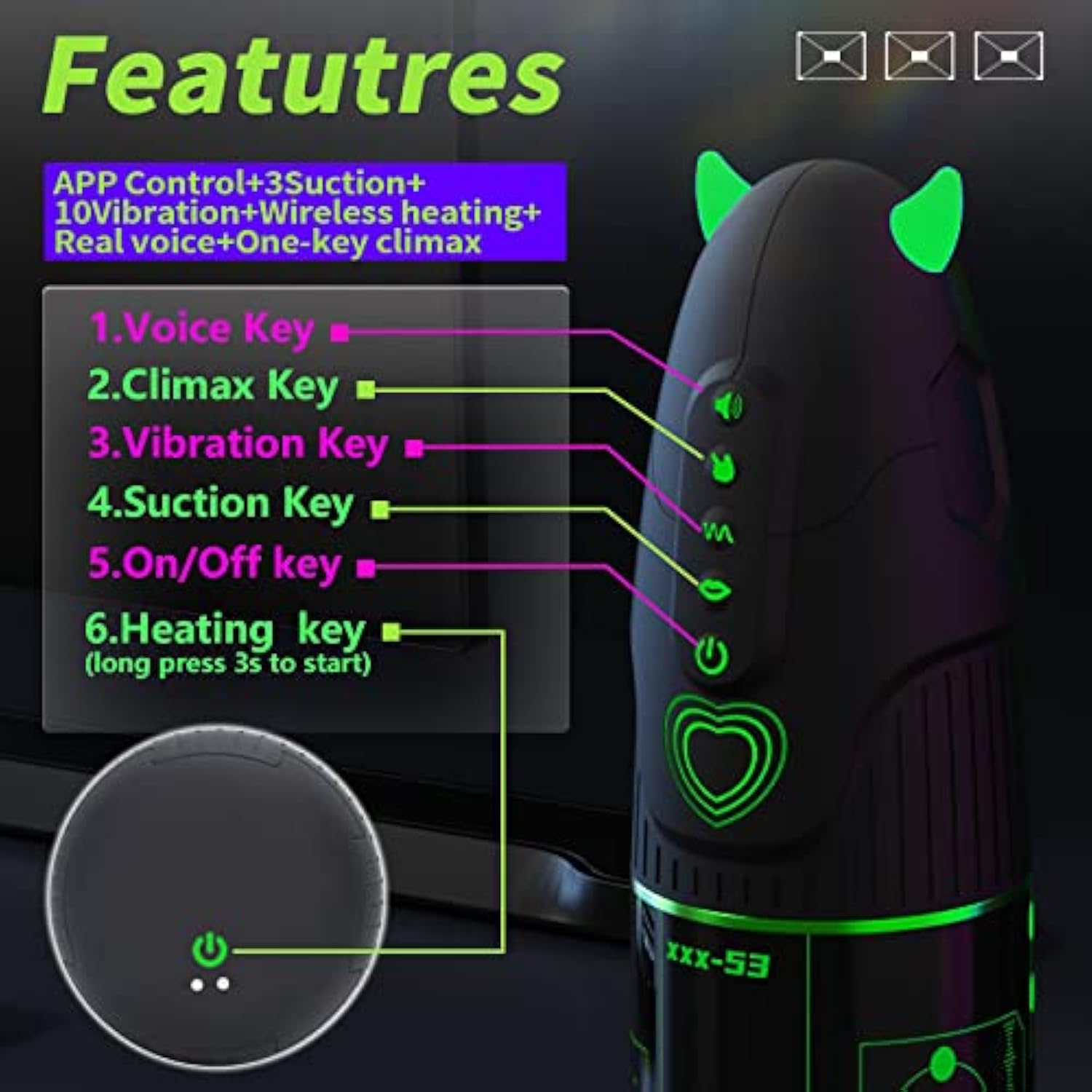 - 6 Functtons Integrated?This Automatic Male Masturbators Comes With App Control, 3 Sucking Intensities, 10 Vibration Modes, Wireless Automatic Heating Function, Real Human Voice And One Button Burst Which Are 6 Functions, Allowing You To Experience Diffe