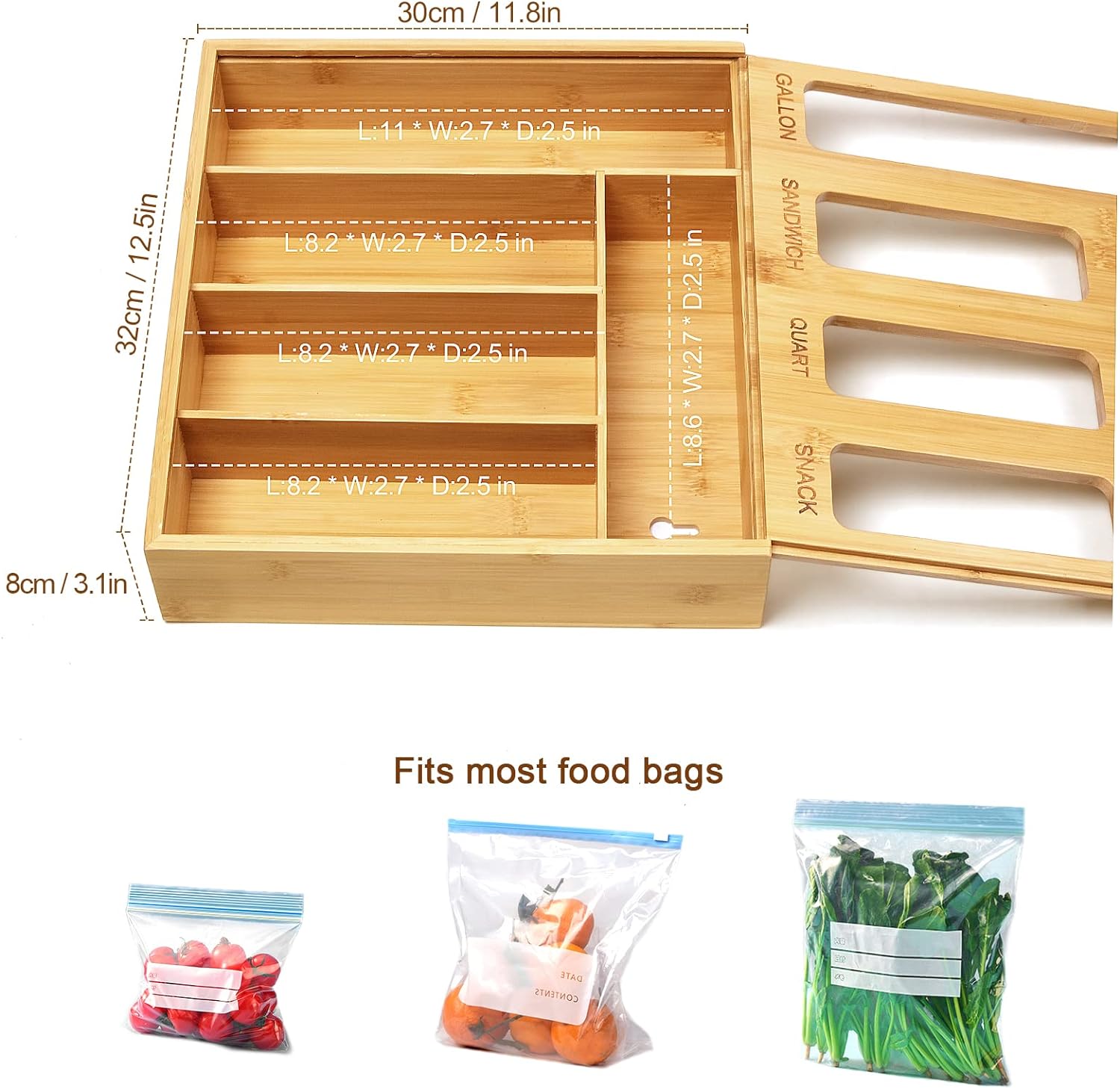 - ✩ FOOD BAG STORAGE ORGANIZER:Use this bamboo organizer box to make your drawer tidy and organized! This baggie organizer and storage is designed specifically for your gallon,quart,sandwish,and snack variety size plastic bags.