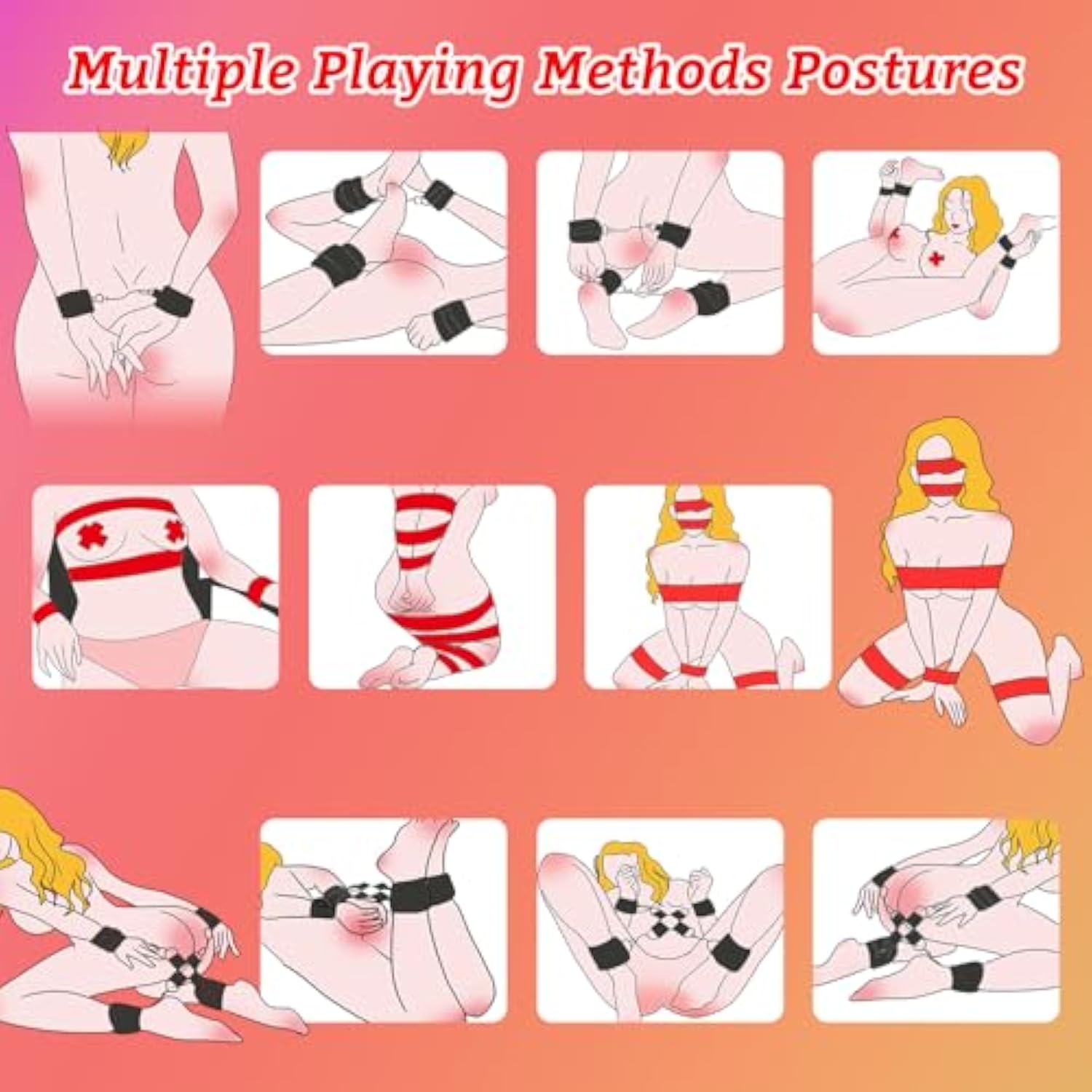 | Thrilling Intimacy Starts Here – 14 Pcs Bondage Set. The Set Includes Sex Straps, Soft Bondage Cuffs, A Blindfold, A Cross Strap, A Tickler, A Feather, A Candle, And Tape-Everything You Need For Playful Exploration. The 6 Adjustable Under-Mattress Straps Are Easy To Set Up And Fit Any Bed Size, Offering Stability And Comfort. Whether You'Re New Or Experienced With Bondage Gear, This Complete Kit Offers A Discreet And Exciting Way To Deepen Your Connection And Spice Up Your Bedroom Play. | | Fits Any Bed – Ready For Every Move. The Under-Mattress Strapping Keeps Everything Securely In Place, Making Setup Quick And Hassle-Free — And You Only Need To Do It Once. Simply Adjust The Durable Nylon Straps To Fit Your Bed Size, Slide Them Under The Mattress, And Clip Each Cuff To The Quick-Release Clasps. Designed For Flexibility And Stability, This Setup Supports A Wide Range Of Positions For Endless Playful Possibilities. | | Soft Secure Bed Restraint Set With Comfort-Driven Materials. Enjoy Control And Comfort With Soft, Sponge-Padded Cuffs That Gently Secure Wrists And Ankles. The Durable Nylon Straps Provide Strong Support Without Sacrificing Softness. Easily Adjust The Bed Straps To Position Your Partner At The Perfect Angle For Deeper Access And Full-Body Exploration—Relaxed, Supported, And Ready For Play. | | Sensory Restraint Kit For Intimate Exploration. Gently Secure Their Wrists, Ankles, And Waist With Soft Cuffs And Adjustable Straps For A Comfortable Yet Firm Hold. Blindfold Them With Satin Fabric To Build Anticipation. Use The Feather Tickler To Trace Their Skin, Teasing With Each Touch. The Soft Candlelight Adds Warmth, While The Tape Provides A Gentle Pull, Heightening The Feeling Of Restraint. Soft Kisses And Tender Touches Turn Each Moment Into A Journey Of Connection And Intimacy. | | Discreet Under-Bed Strapping. The Adjustable Straps Fit Discreetly Under Your Mattress, Keeping Everything Out Of Sight When Not In Use. No One Will Know They'Re There, But When You'Re Ready To Explore, Simply Pull Them Out And Set Them Up With Ease. These Straps Fit Any Size Bed, Including King-Sized, Making It Simple To Create A Secure And Exciting Experience Whenever You Choose. | |
