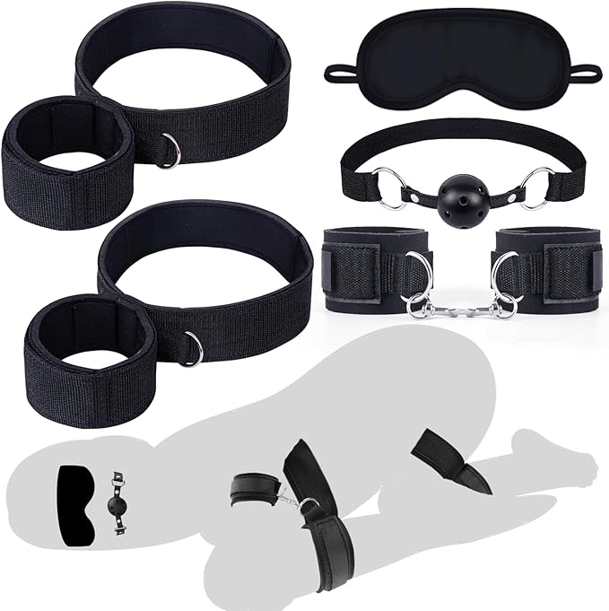 BDSM Restraint Kit with Wrist to Thigh Cuffs, Blindfold, Ball Gag & Bondage Gear