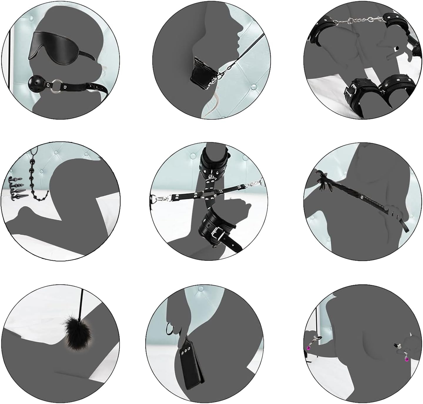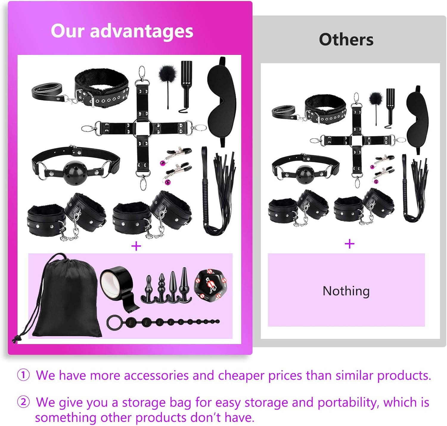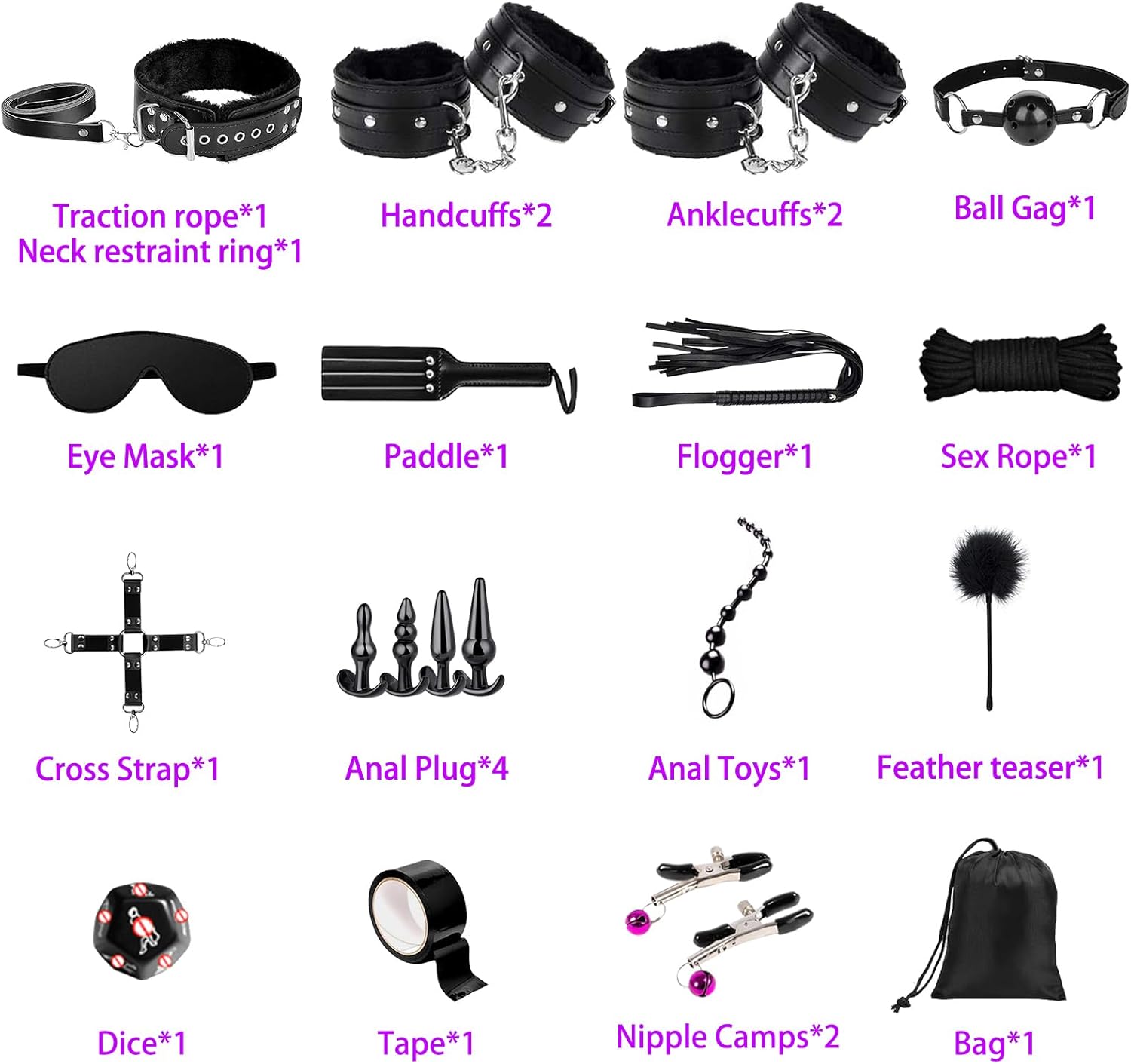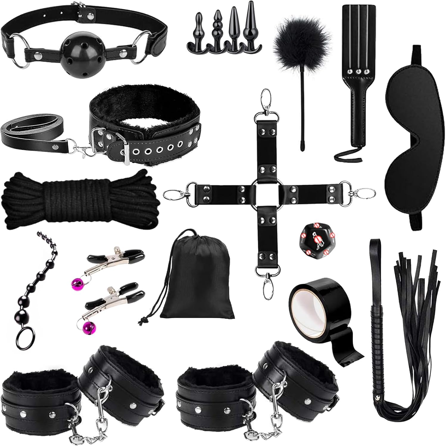 Complete 23-Piece Bondage Kit – Includes handcuffs, ankle cuffs, a neck restraint, ball gag, flogger, feather teaser, blindfold, cross strap, sex rope, paddle, nipple clamps, anal plugs, traction rope, tape, dice, and a convenient storage bag for easy organization and portability.