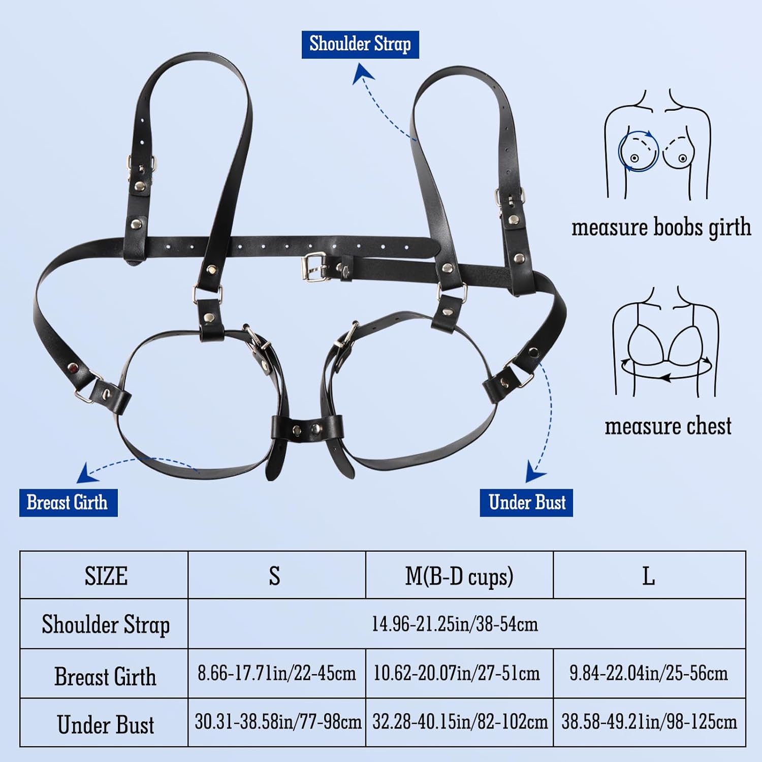 This chest harness features independently adjustable shoulder and breast straps for a secure and comfortable fit. Designed to accommodate B to D cup sizes, it can also fit E cups for a more restrictive experience. Suitable for underbust sizes ranging from 34.64 to 43.31 inches. Non-stretchable for firm support.Premium Double-Layer PU Leather