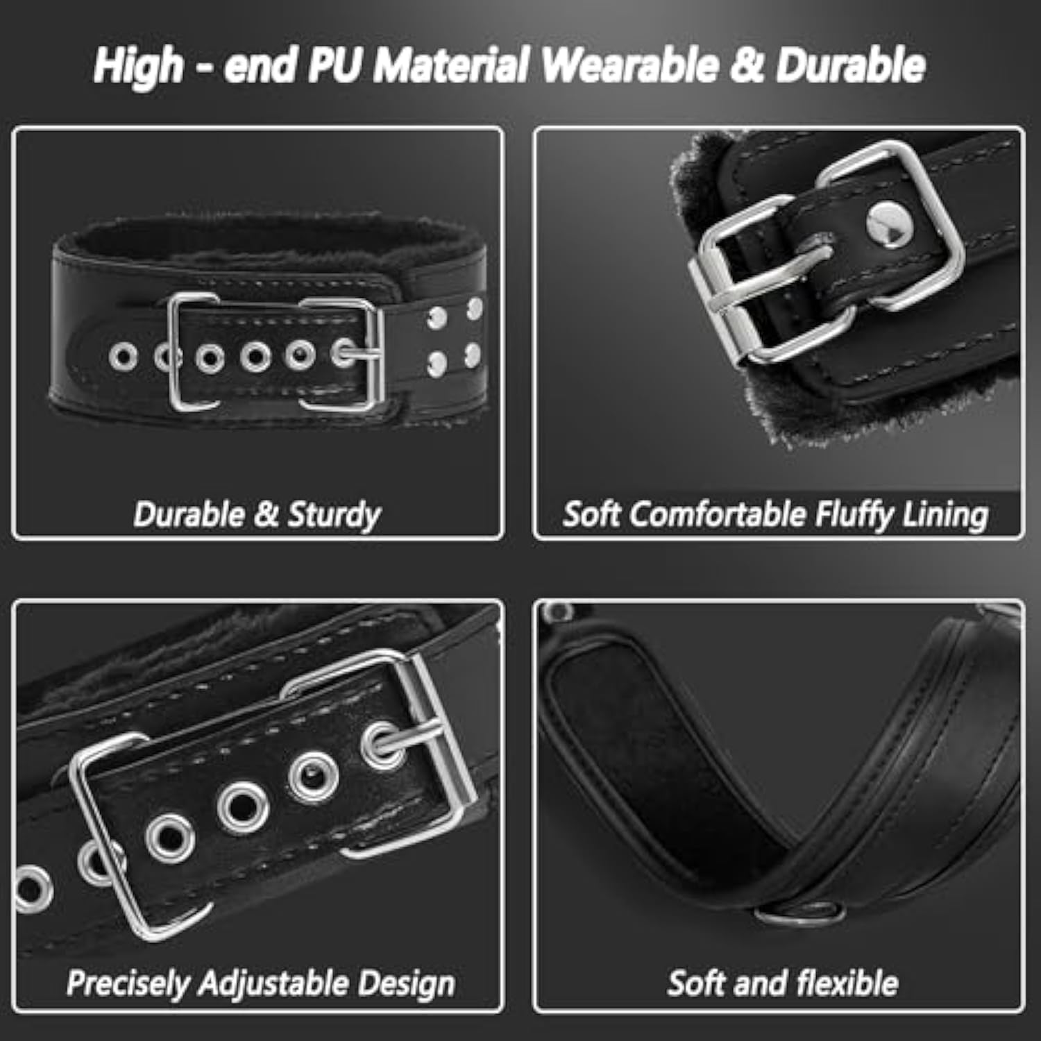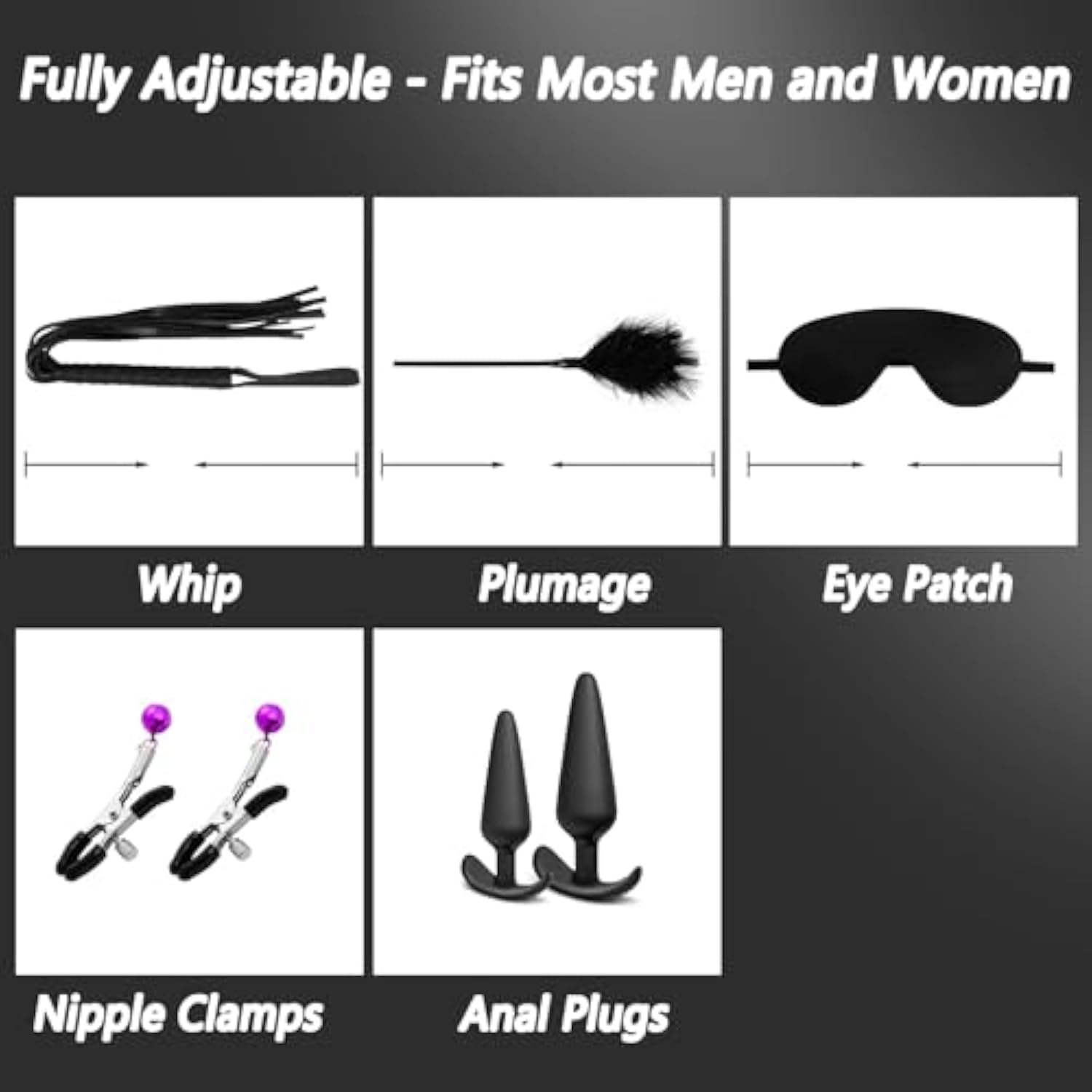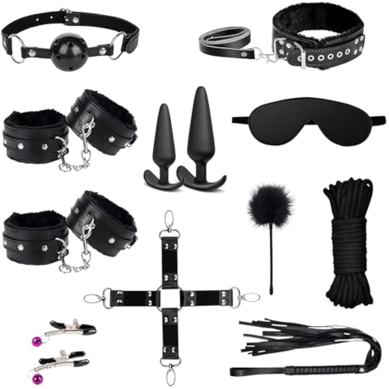 - ?11-Piece Bondage Set Turns All Your Fantasies Into Reality?1.Set Of Handcuffs; 2.Set Of Ankle Handcuffs; 3.Set Of Nipple Clamps; 4.Leather Whip; 5.Ball Gag; 6.A Cross Strap Connector; 7.Feather Pick; 8.Eye Mask; 9.Collar And Tie; 10.Cotton Rope; 11. An