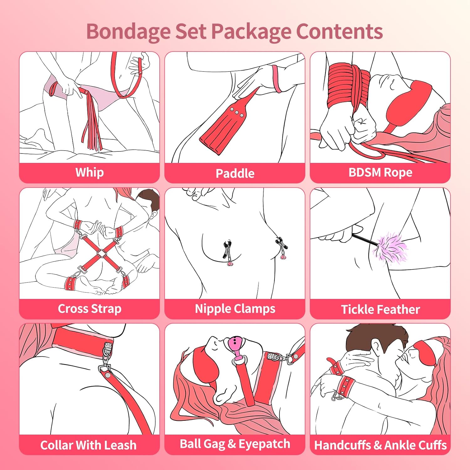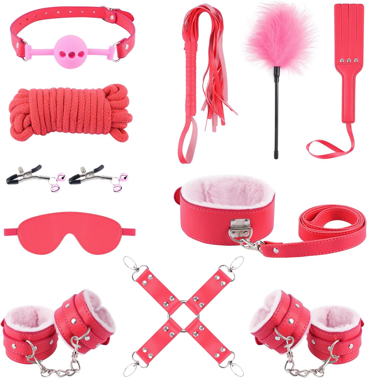 This 11-piece set features essential BDSM accessories, including a blindfold, ball gag, whip, rope, nipple clamps, and tickler, allowing for endless possibilities in restraint and sensory play. The combination of these tools enhances intimate experiences for both partners.Premium Materials & Craftsmanship