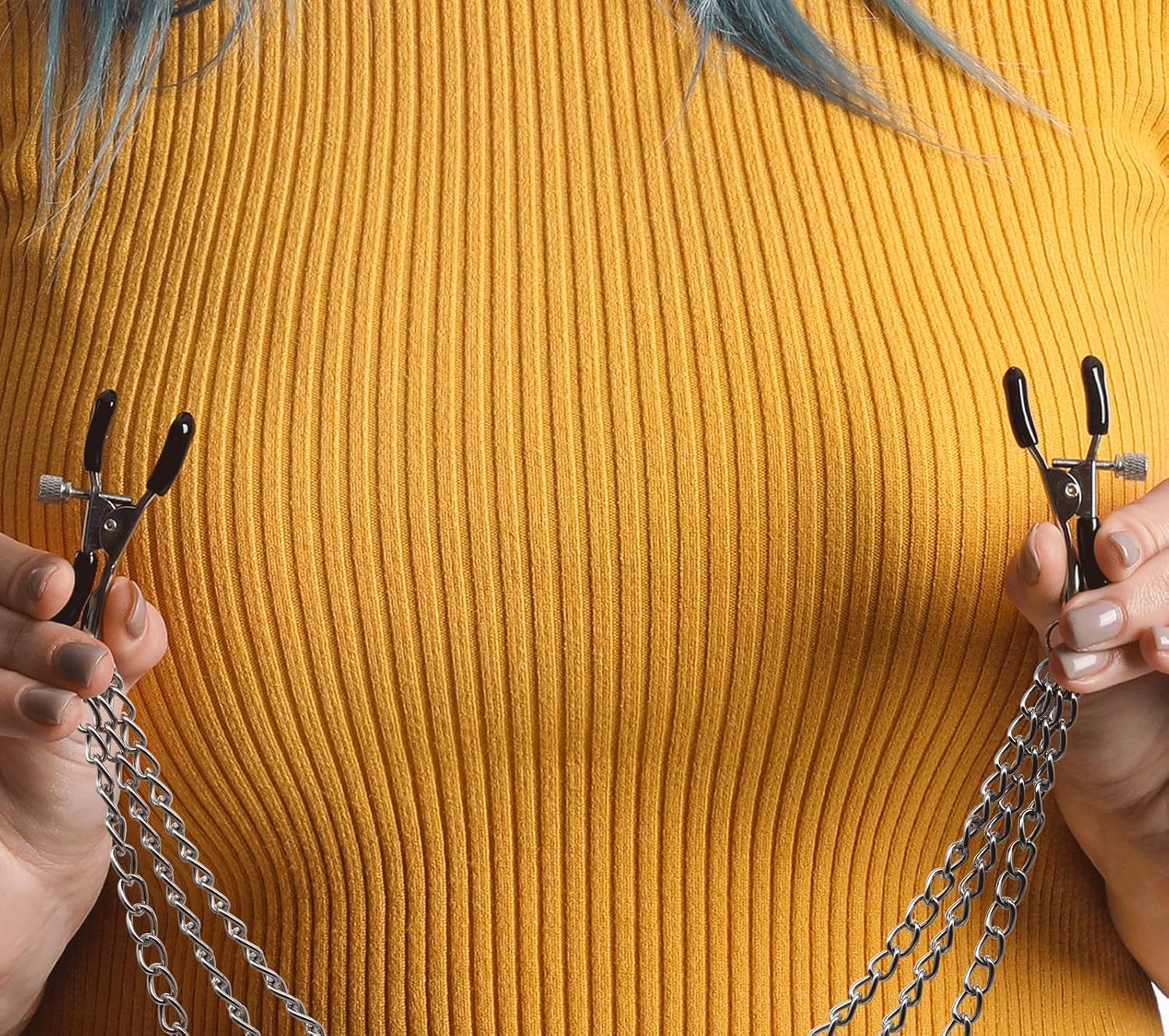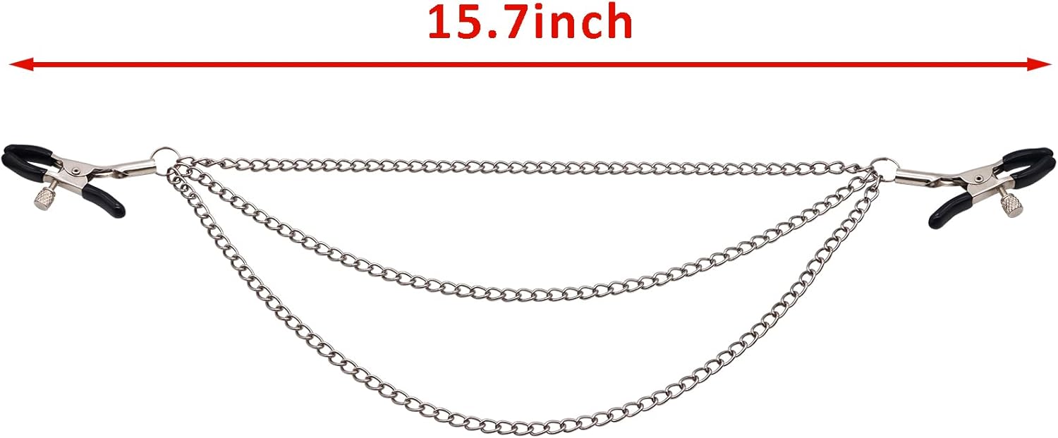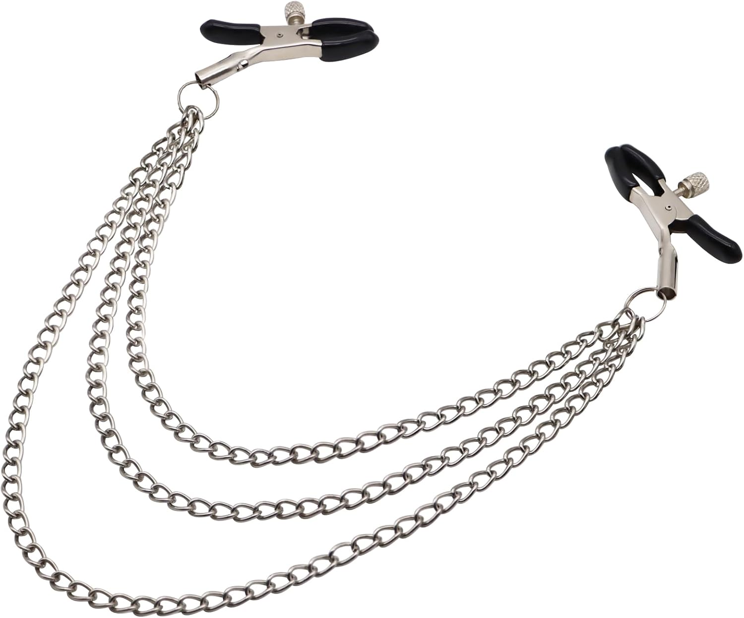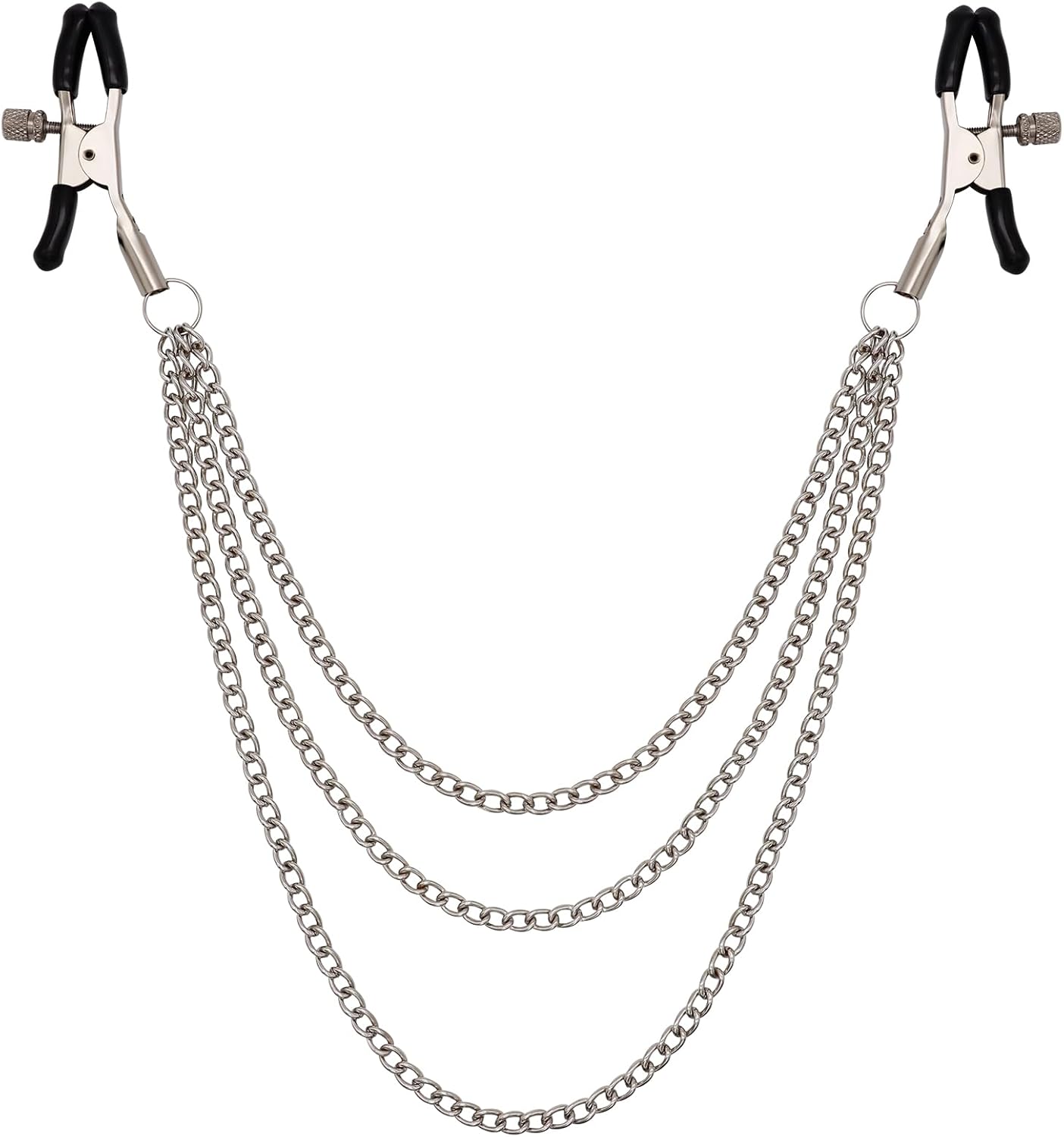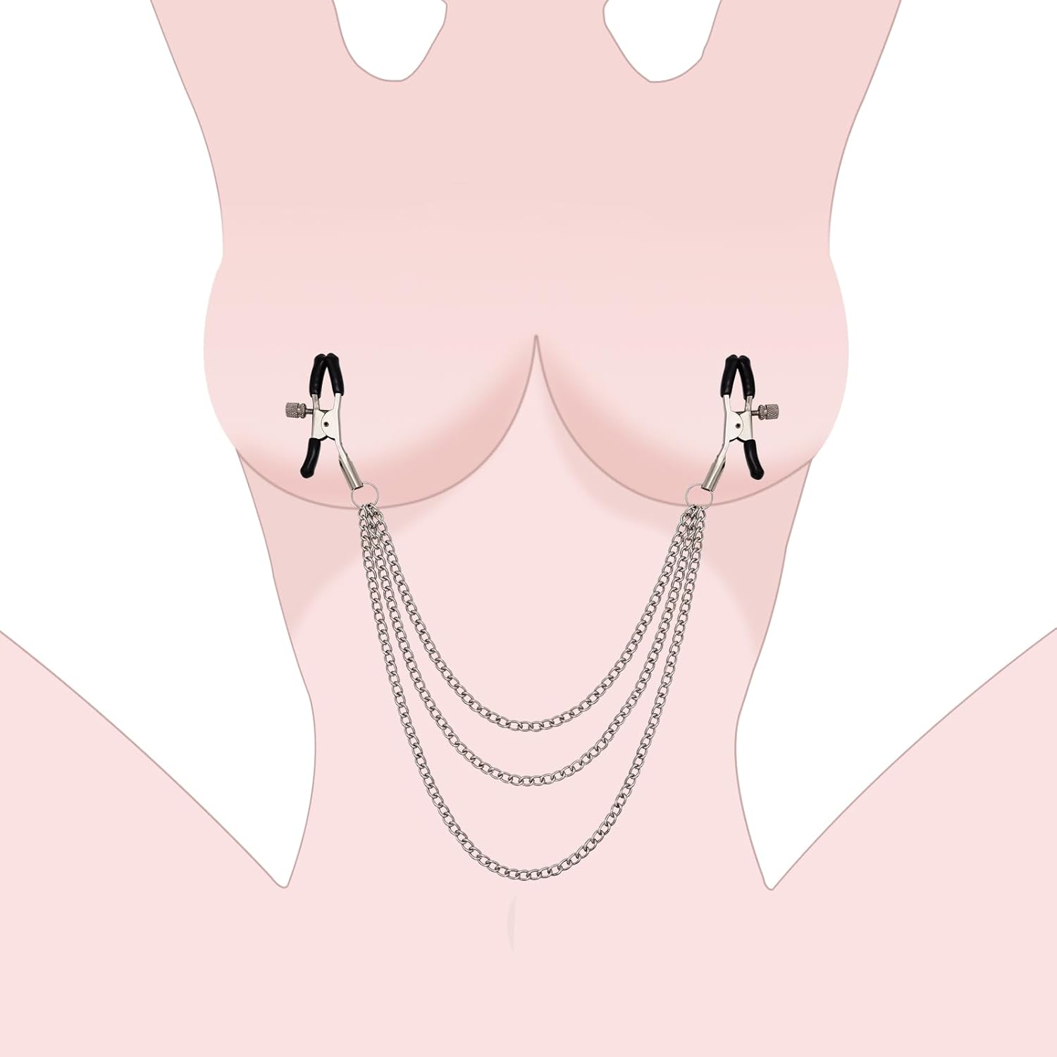 Explore the world of sensation play with these adjustable nipple clamps, designed for both beginners and experienced users. Connected by three cascading metal chains, they offer elegant and heightened sensitivity, making every touch feel more intense. Perfect for exploring different BDSM dynamics, these clamps enhance your pleasure with customizable tension.