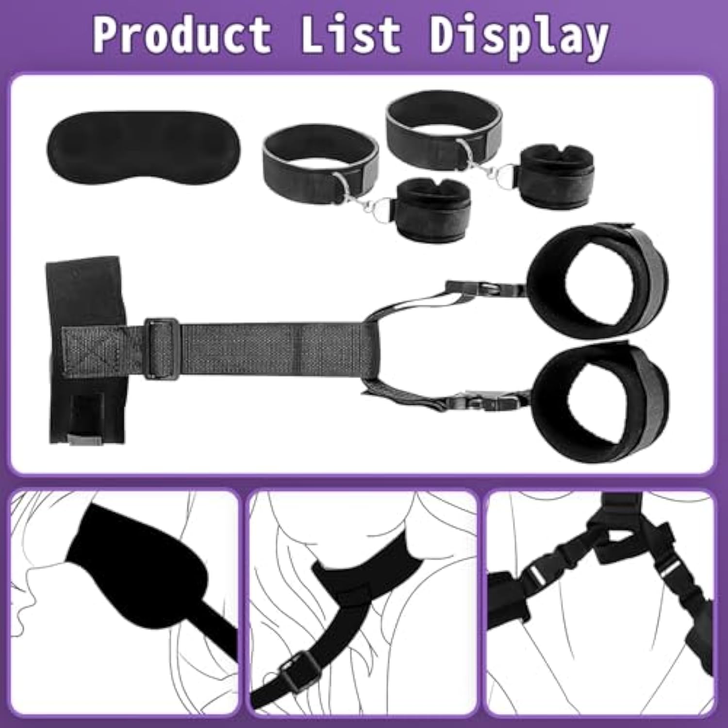 | 2 In 1 Bdsm Bondage Restraints Set: This Bdsm Kit Restraints Set Is Newly 2 In 1 Designed, Include Sex Collar, Wrist Thigh Cuffs, Sexy Blindfold And A Pair Detachable Sexy Cuffs, Can Provide More Sex Plays Of Different Positions For Couples Sex Games. | | Enhance Your Intimate Experience: If You Want To Add Some Excitement And Intimacy To Your Bedroom, You Can Try This Sex Bondage Set. It Will Help You Unlock More Sexual Positions And Have More Fun In Your Sex Life. With This Sex Toy, You May Explore Your Deepest Fantasy And Give Your Lover A Crazy Experience. | | Fully Adjustable Fit For Any Sizes: This Bdsm Kit Is Designed With Adjustable Sex Straps, Allowing You To Adjust The Tightness And Length According To Your Preferences, Making It Suitable For All Kinds Of Users, No Matter You Are Beginners And Experienced Sm Lovers. | | Durable And Comfortable Material: Our Bondage Bdsm Toys Made Of High-Quality And Skin-Friendly Materials, So That It Is Not Only Soft And Comfortable To Wear, But Also Sturdy Enough For Long Term Use. | | Secret Gift For Couples: Our Wrist And Thigh Cuffs Bondage Restraints Set Features A Sexy And Seductive Design, Making It A Perfect Gift For Couples Who Want To Explore Some Excitement To Their Relationship. And The Sex Toy Will Packaged Secretly To Your Hands To Protect Your Privacy. | |