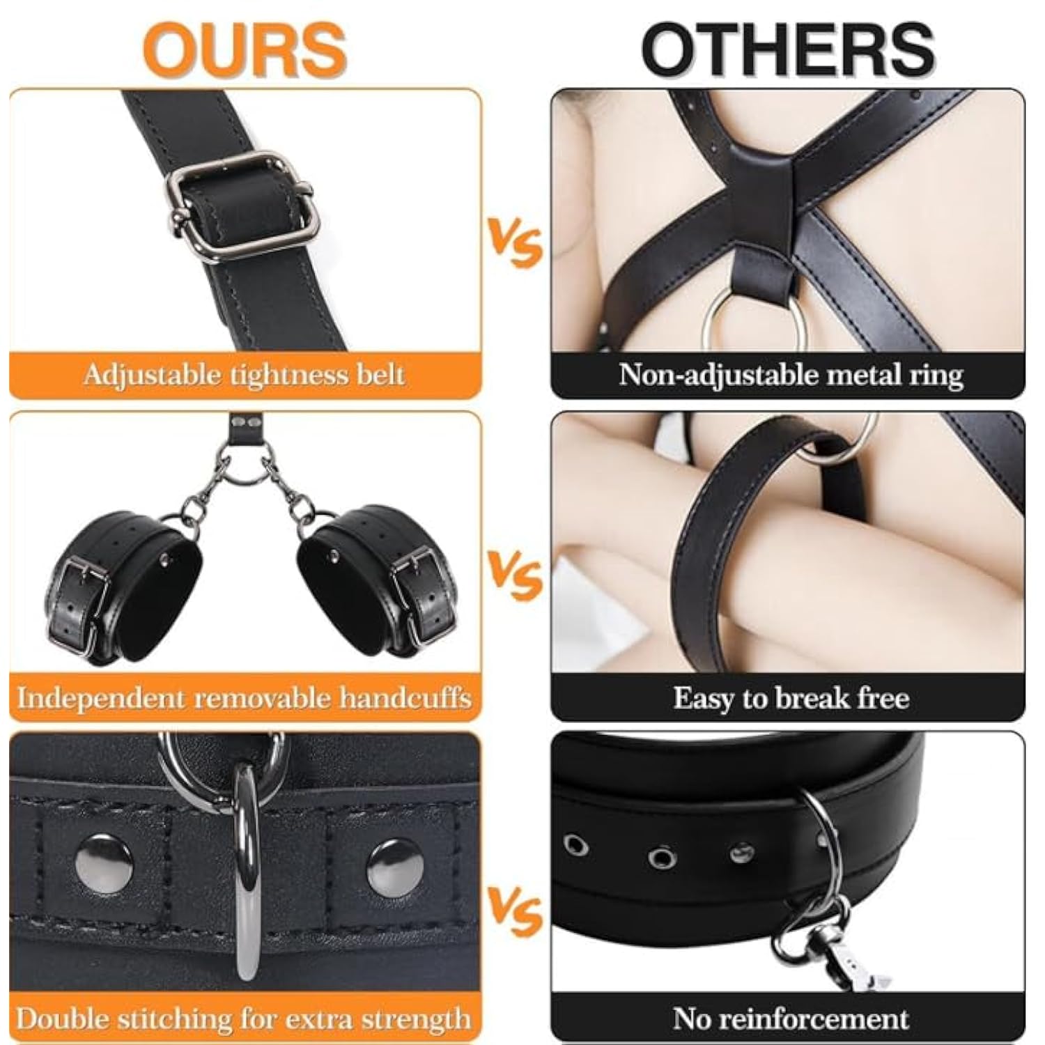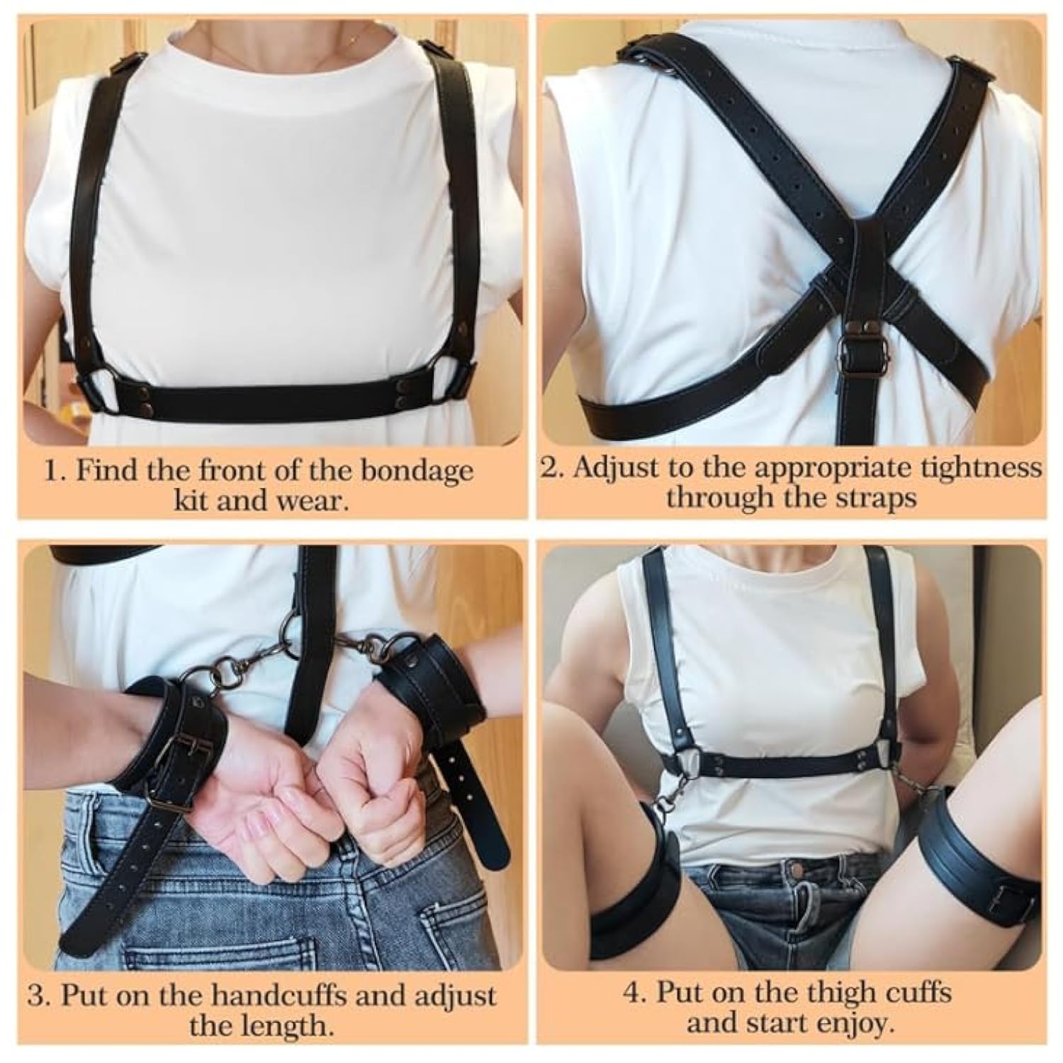 | High Quality Leather Material: Our Bdsm Bondage Kits Are Made Of High Quality Pu Leather, Which Is Soft To The Touch, Resilient, Not Easy To Break, Durable, Non-Toxic And Odorless, Safe And Comfortable To Wear, And Won'T Hurt Our Skin. | | Size Freedom: This Product Is Designed With Metal Buckle Adjustable Design, The Handcuffs Can Be Detached And Connected Freely, You Can Pose Differently Also Can Be Freely Adjusted To The Size You Want According To Your Body Type, Suitable For The Vast Majority Of People To Use. | | Release The Charm, Enhance The Attraction: When Your Lover Caresses You With His Hand, Along The Curve Of Your Body, Grab Your Wrist, With Handcuffs Firmly Handcuffed To The Chest Or Waist, At This Moment More Highlight Your Body, Release Your Sex Appeal! | | Ideal Gift: Our Bdsm Leather Handcuff Corset Corset Strap Binds Your Hands And Body Together, Perfect For Sm Sex Play Between Couples. Its Smooth, Soft And Lightweight Leather Texture Makes It Comfortable And Secure To Wear. Giving This Corset Harness To Your Lover Will Not Only Add More Passion To Your Sex Life, But Also Enhance Your Relationship With Each Other. | | Attentive Service And Rigorous Packaging: Our Products Will Be Delivered To You In Concealed Packaging, Which Will Not Reveal Product Information And Divulge Your Personal Privacy, If You Encounter Any Problems In The Use Of The Product, You Can