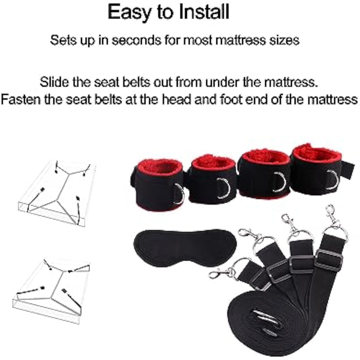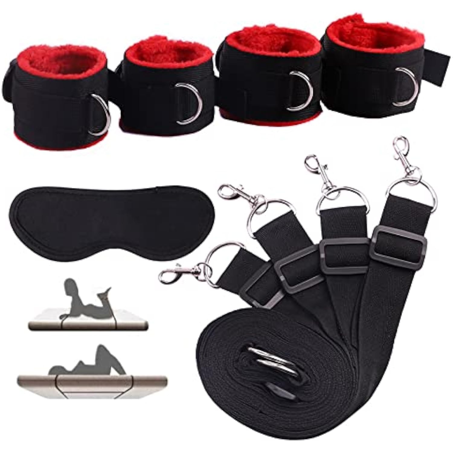 - [Bed Bondage Restraints Kit] Bed Straps X2 Pcs, Handcuffs X2Pcs, Ankle Cuffs X2Pcs, Eye Mask X1Pcs, Small Package, Light And Easy To Carry. Perfect For Travel, Hotels, Etc. You Can Use It Freely In Bed And Enjoy Wild Sex, And It Is Also A Special Gift F