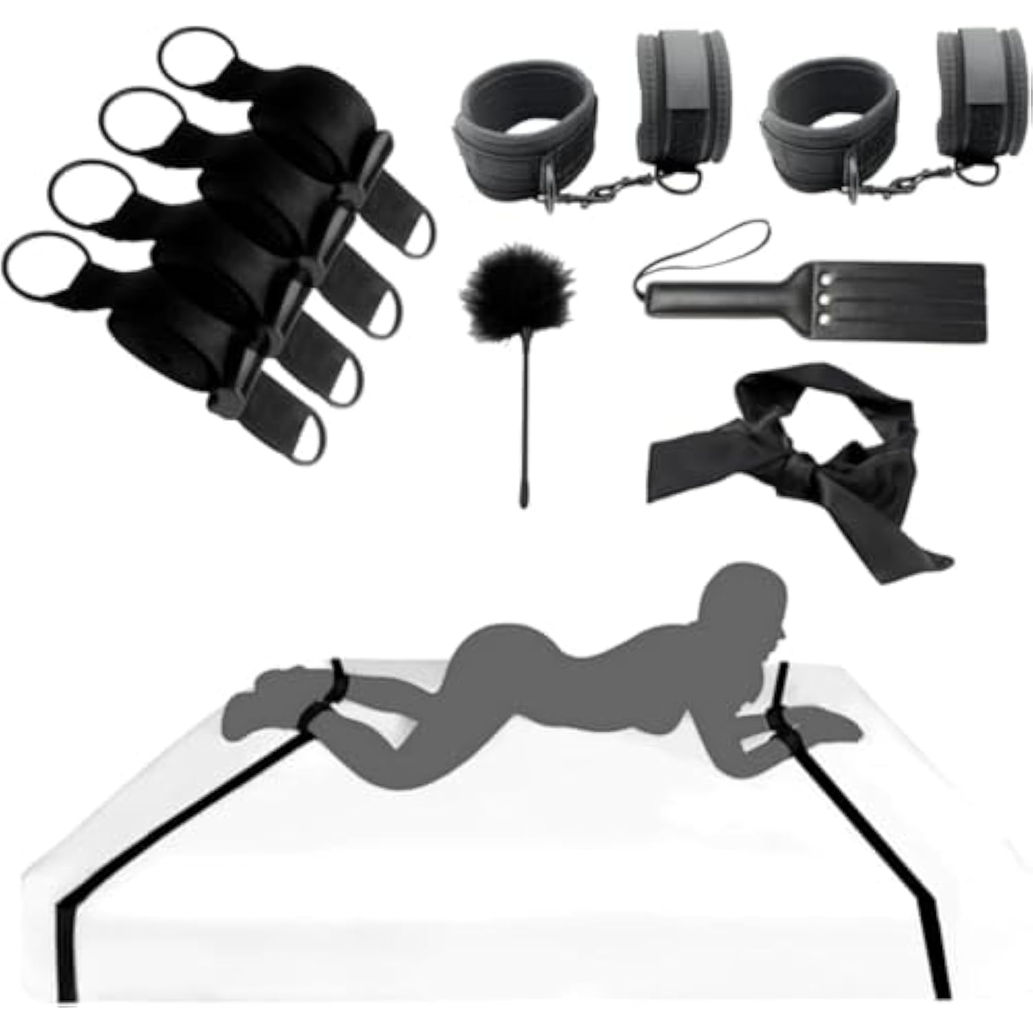 - Bed Bondage Kits: The Bed Restraint Set Comes With 4 Separate Straps: 59 Inches Each, 2 Handcuffs, 2 Ankle Cuffs, Blindfold, Paddle, And Feather.Whether You Are A Bdsm Beginner Or An Experienced Sm Lover, This Bondage Kit Can Satisfy Your Sexual Needs <
