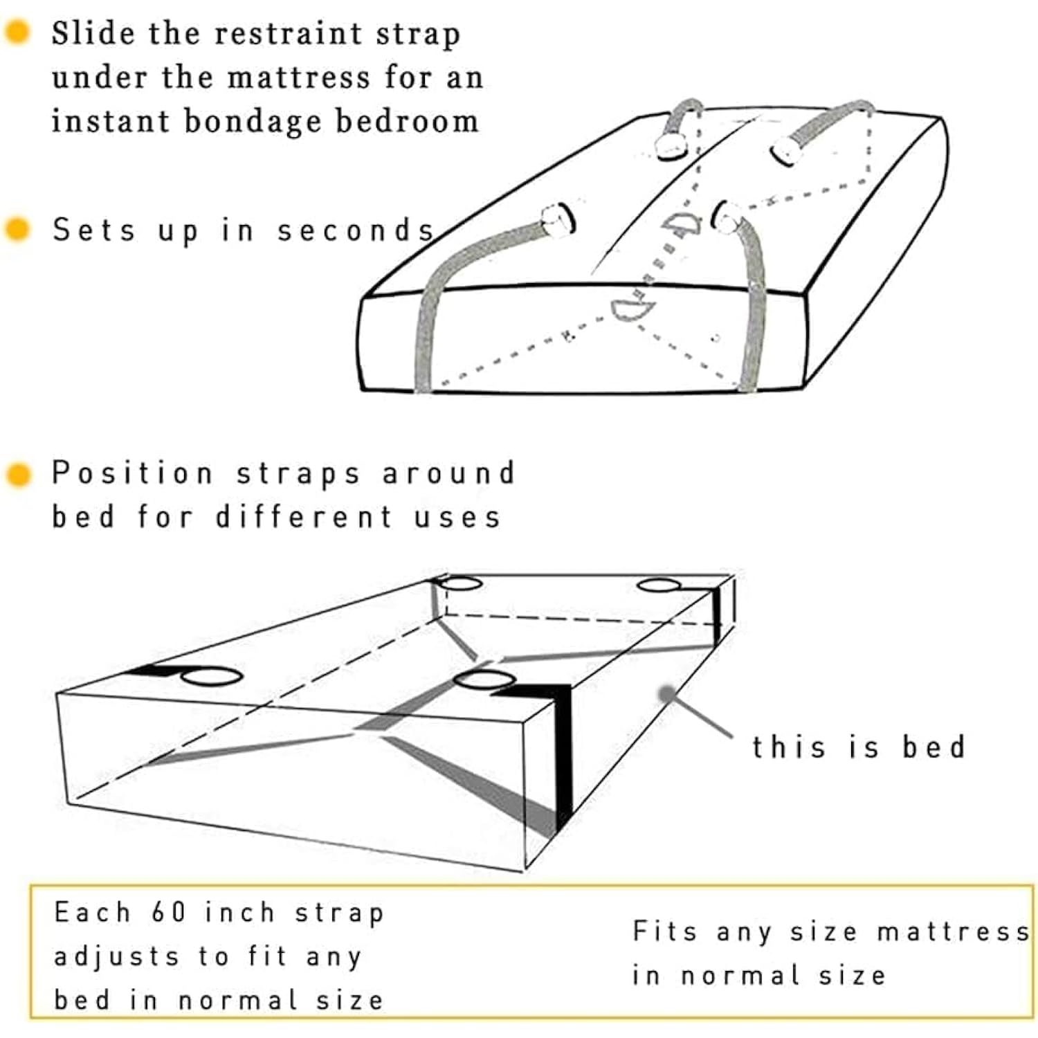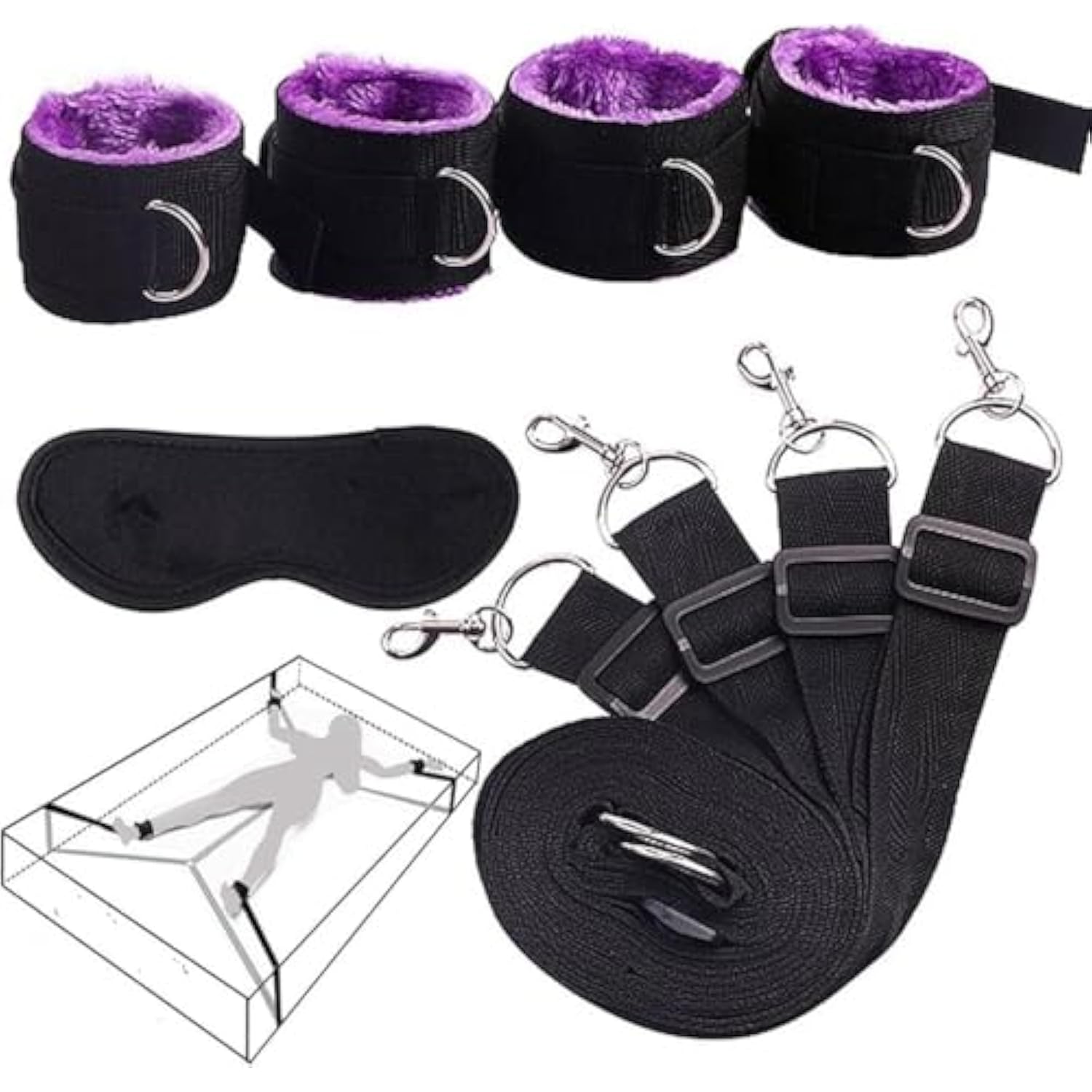 | Premium Sex Toys: Sex Toy Sets For Couples Are Made Of High Quality Nylon, Non-Toxic, Odourless, Comfortable And Durable. | | Easy Bondage Set: The Bed Straps Are Equipped With A Full Connection And Do Not Need To Be Installed, But Just Place Correctly Under The Mattress According To The Picture Instructions. The Hand/Ankle Cuffs Are Connected To The Bed Straps By Carabiners, And The Whole Process Is Quick And Easy. | | The Bondage Restraint Set Is So Soft That It Does Not Cut Into The Skin If It Is Too Tight, It Protects The Wrists And Ankles From Injury And Is Ideal For Long Sex Games. | | Sm Bondage Set Includes: Bed Straps X1 Set, Handcuffs X2 Pieces, Ankle Cuffs X2 Pieces, Eye Mask X1 Piece, Small Package, Lightweight And Easy To Carry. Perfect For Travel, Hotels Etc. You Can Use It Freely In Bed And Enjoy Wild Sex, And It Is Also A Special Gift For Your Sex Partner. | | Perfect Gift: You Want To Surprise Her Or Him For An Anniversary, Wedding Day, Valentine'S Day Or Birthday And Christmas, Our Bondage Set Bed Is The Erotic Gift Idea For Men And Women. Perfect For Those Who Want To Bring A Little Freshness And A Few New, Creative And Joyful Moments Into Their Love Life. | |
