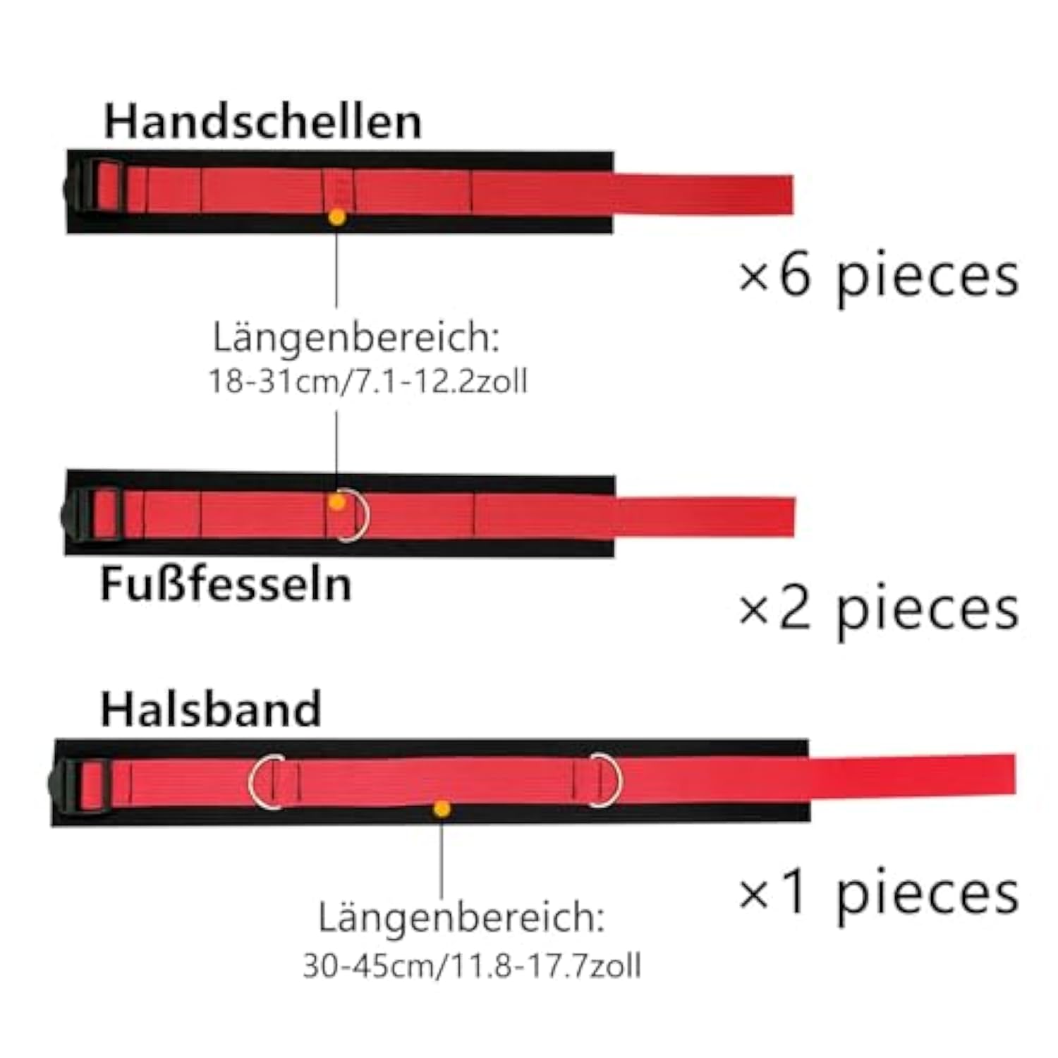 | Sm Bondage Bed Restraints Sex Set: Bed Straps X1 Set, Hand Cuffs X6Pcs, Ankle Cuffs X2Pcs, Collar X1Pc, Small Package, Lightweight And Easy To Carry. Perfect For Travel, Hotels, Etc. You Can Use It Freely In Bed And Enjoy Wild Sex, And It Is Also A Special Gift For Your Sexual Partner. | | Adjustable Sex Restraint Set: The Size Of The Bed Restraint Set Is Adjustable, And Is Suitable For Almost All Bed Sizes. In Addition, The Size Of The Shackles And Cuffs Is Adjustable, There Will Always Be A Size That Suits Him. Whether You Are An Experienced Bondage Player Or A Beginner Who Wants To Try Sm, This Adult Bondage Set Is Perfect For Any Bondage Lover. | | Easy Bondage Set: The Bed Straps Are Designed With A Full Connection And Do Not Need To Be Installed, Just Place Them Correctly Under The Mattress According To The Picture Instructions. The Hand/Ankle Cuffs Are Connected To The Bed Straps By Carabiners, And The Whole Process Is Simple And Quick. When Not In Use, You Can Hide The Restraint Set Under The Mattress To Avoid Embarrassment. | | Premium Sex Toys: Sex Toy Sets For Couples Are Made Of High Quality Nylon, Non-Toxic, Odorless, Comfortable And Durable. The Bondage Restraint Set Is So Durable That It Won'T Cut Into The Skin If It'S Too Tight, It Protects The Wrists And Ankles From Injury And Is Ideal For Long Sex Games. | | Perfect Gift: You Want To Surprise Her Or Him For Their Anniversary / Wedding Anniversary / Valentine'S Day Or Birthday And Christmas, Our Bondage Set Bed Is The Erotic Gift Idea For Men And Women. Perfect For Anyone Who Wants To Bring A Little Freshness And A Few New, Creative And Joyful Moments Into Their Love Life. | |