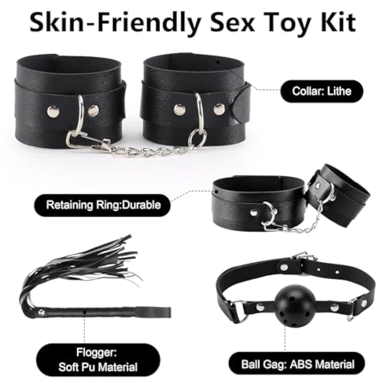 This Sex Bondage Kit Consists Of 10 Parts, A Pair Of Handcuffs, A Pair Of Ankle Cuffs, A Ball Stopper, A Collar, A Blindfold, And A Leather Whip, A Anal Plug, A Traction Rope, Nipple Clamps, A Cross Strap. | | Bondage Gear Accessories: Soft, Comfortable, Safe And Durable, Discreet. | | Bdsm Toys Are Quite Suitable For Beginners And Sm Lovers. Size Is Adjustable, Which Is Suitable For Both Men And Women. | | Friendly Bondage Restraints Sex Toys Are Designed To Provide A Comfortable And Safe Experience For The Wearer. The Cuffs And Collar Are Made Of Durable Leather And Lined With Soft, Plush Material That Won'T Cause Any Discomfort. With Limited Mobility, The Wearer Is Sure To Squirm In Pleasure. | | Upgrade Bondage 10Pcs Kits, Double Fun - Cosplay, Bondage And Discipline, Dominance And Submission. The Eagle, Doggy Style,Butterfly Position, Missionary, Oral Sex Position. You Can Explore A New World With This Sex Toys. | |