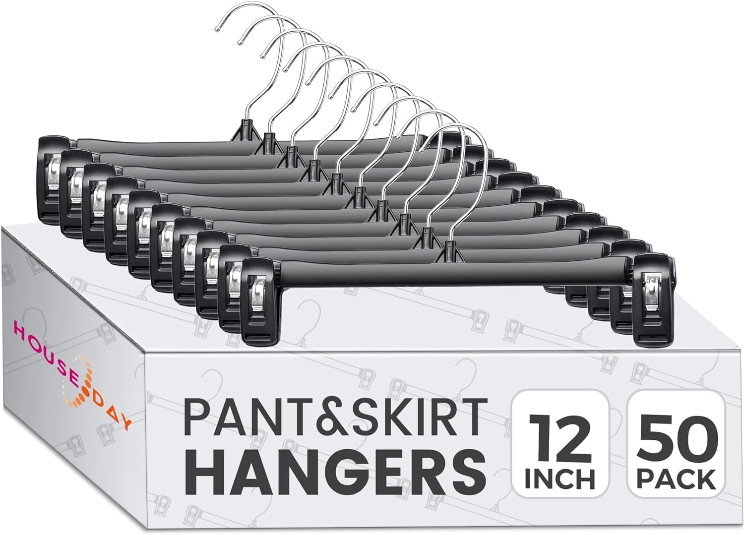 - Business and Home Essentials - 50 pack plastic pants hangers are great for the price, good for both store and home use. HOUSE DAY bottom hangers measures 12" in length, 6.5" in height, perfect for pants, skirt, bras, dress, bras, jeans, jeggings, shorts, etc.