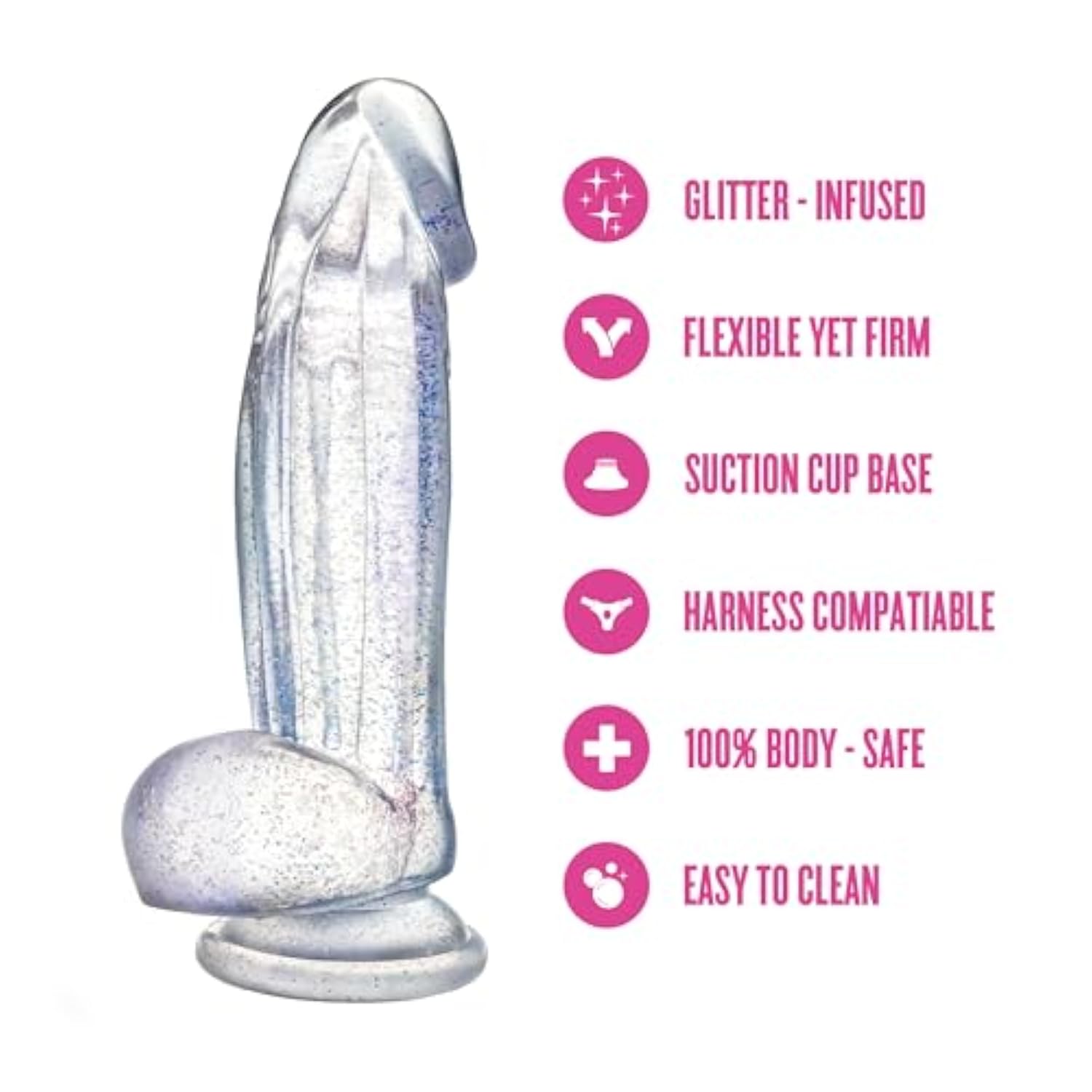| Realistic Design – Lifelike Shape With Rounded Tip For Smooth Insertion. Designed For G-Spot Or Anal Pleasure. Glitter-Infused Finish Adds A Playful Touch And Eye-Catching Visual Appeal | | Powerful Suction – Secure Suction Cup Attaches To Most Flat Surfaces For Hands-Free Use. Ideal For Shower, Tile, Or Bedroom Play. Easy To Position For Creative And Versatile Play Styles | | Harness Compatible – Fits Most Standard Strap-On Harnesses For Dynamic Partner Play. Stays In Place During Movement. Also Great For Solo Use With Added Control And Position Variety | | 100% Body-Safe – Made From Non-Porous, Phthalate-Free Material. Safe For Vaginal And Anal Play. Easy To Clean With Soap And Water Compatible With Water-Based And Hybrid Lubes | | Perfect Size – 6-Inch Total Length (5.5 Inches Insertable) And 2 Inches Thick. A Comfortable Fit For Beginners And A Satisfying Choice For Experienced Users Alike | |