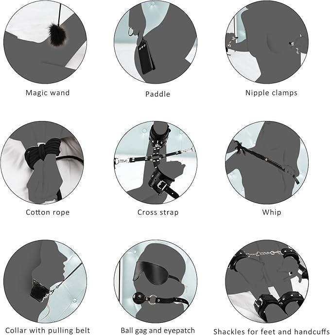 - This 11-piece bondage set is designed to enhance intimacy and exploration. It includes handcuffs, shackles, nipple clamps, a whip, a rope, a gag, a feather tickler, a collar, a cross strap, a blindfold, and a paddle. Made from high-quality leather and nylon, it is safe and comfortable for both men and women. With adjustable features, this set allows for various restraint and suspension positions, catering to different preferences. The discreet packaging ensures privacy, making it an ideal choice for those looking to add excitement to their intimate moments.