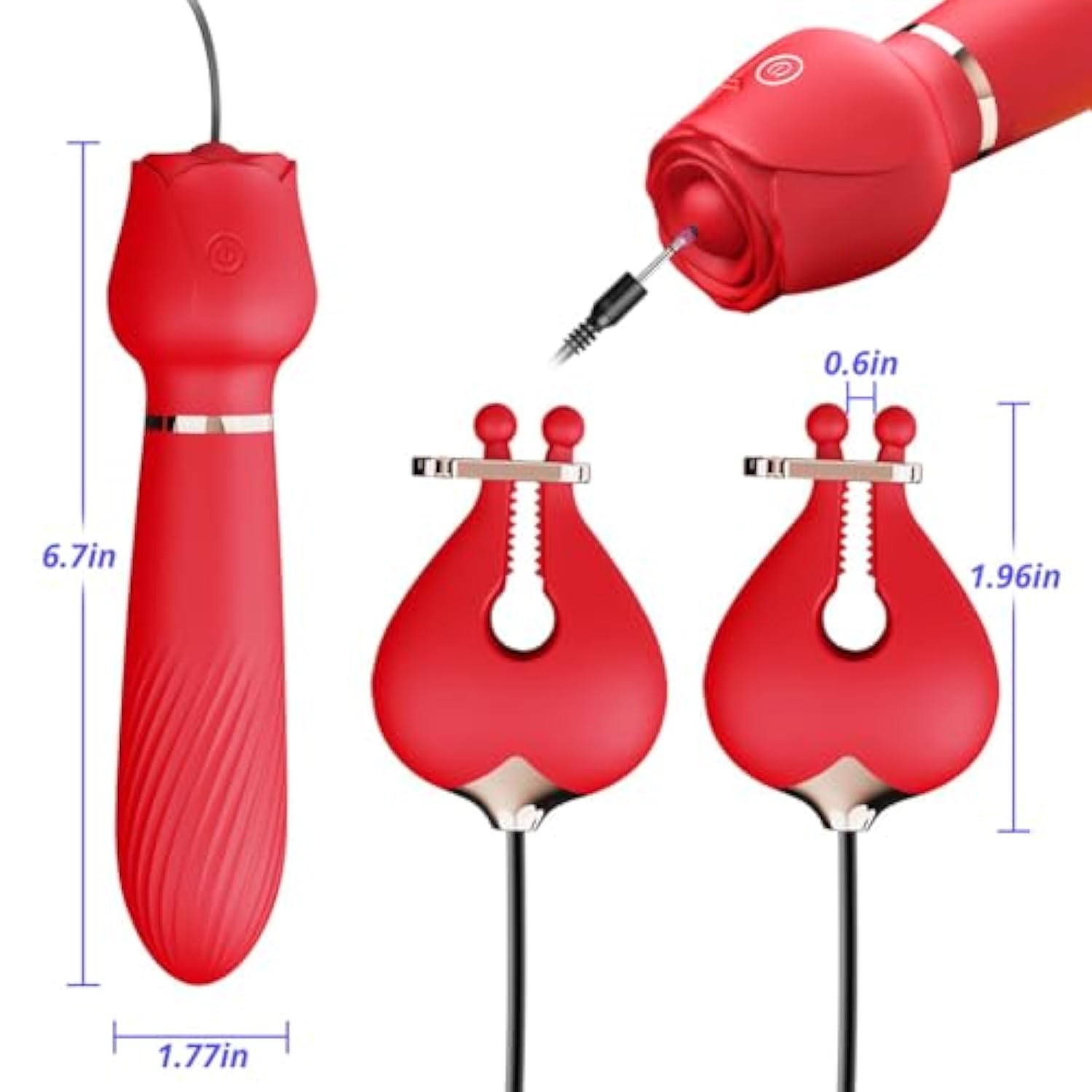 | 10 Vibration Modes: A Variety Of Frequency Options Can Make The Stimulation More Rich, Bring You A Pleasurable Experience. Sex Beginners Can Start With Low Frequency, Transition To Medium Frequency And Finally Use High Frequency. Let You In The Constant Pleasure, Gradually Improve Experience In Sex, Grow Into A Sex Expert | | 2 In 1 Sex Toys: Sex Toy Consists Of Clitoral Vibrators And Nipple Clamps, Which You Can Choose To Use Alone Or In Combination. A Variety Of Ways To Play Will Enrich Your Sexual Experience And Bring You More Fun | | High Quality Material: Female Vibrator Is Made Of Silicone With Smooth Texture And Excellent Tactile Feeling, Allowing You To Have A Comfortable Sex Experience When Entering | | Adjustable Nipple Clamps: The Nipple Clamps Have Two Adjustable Snap Positions That Allow You To Change The Position Of The Nipple For Different Stimulation Sensations. Enjoy The Tugging And Vibrating Sensations Of The Nipple Clamps, Which Will Be A Double And Wonderful Pleasure Experience | | Multiple Plays: Vibrator Wand Is Not Only Beautiful, But Also Very Practical. It Can Be Inserted Not Only Into The Vagina As A Clitoral Vibrator, But Also Into The Anus As An Excellent Anal Vibrator | | Rechargeable Design: The First Time You Use G Spot Vibrator Before Please Charge, Usb Charging Hole In The Center Of The Flower. Portable Charging Cable Makes Charging More Convenient, But Also Allows Prostate Vibrator Can Be Carried Around, You Can Always Open A Wonderful Sex Journey | | Low Noise And Waterproof: As A Discreet Sex Toy, Clitoral Vibrator Is Quiet In Operation, Ensuring Your Privacy During Intimate Moments. And The Waterproof Design Is Very Easy To Clean And Maintain Before And After Use | |
